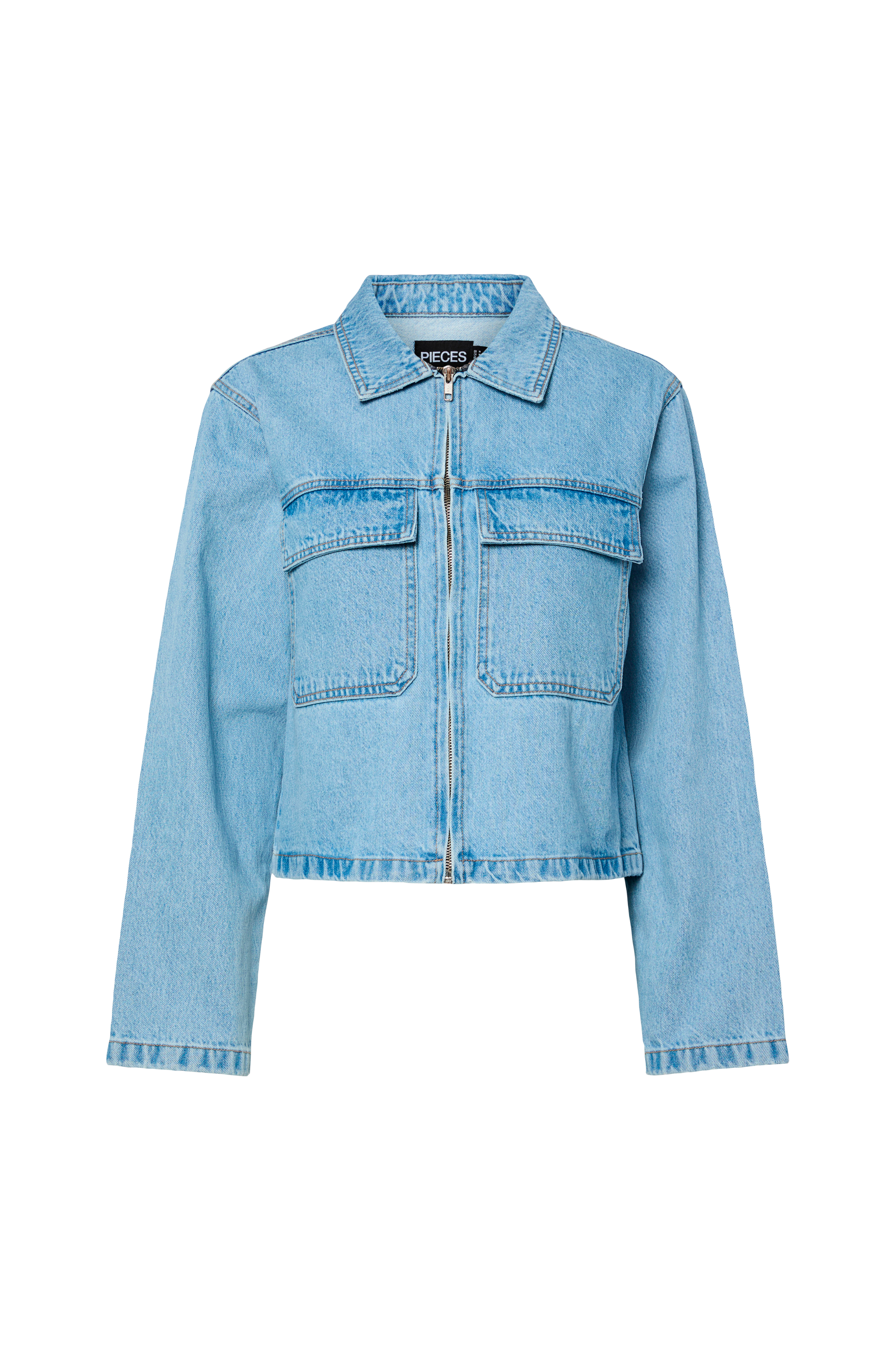 • Jakke i denim• Lange ermer• Skjortekrage• To brystlommer med lokk• Glidelåslukking• Lengde: 49 cm i størrelse S