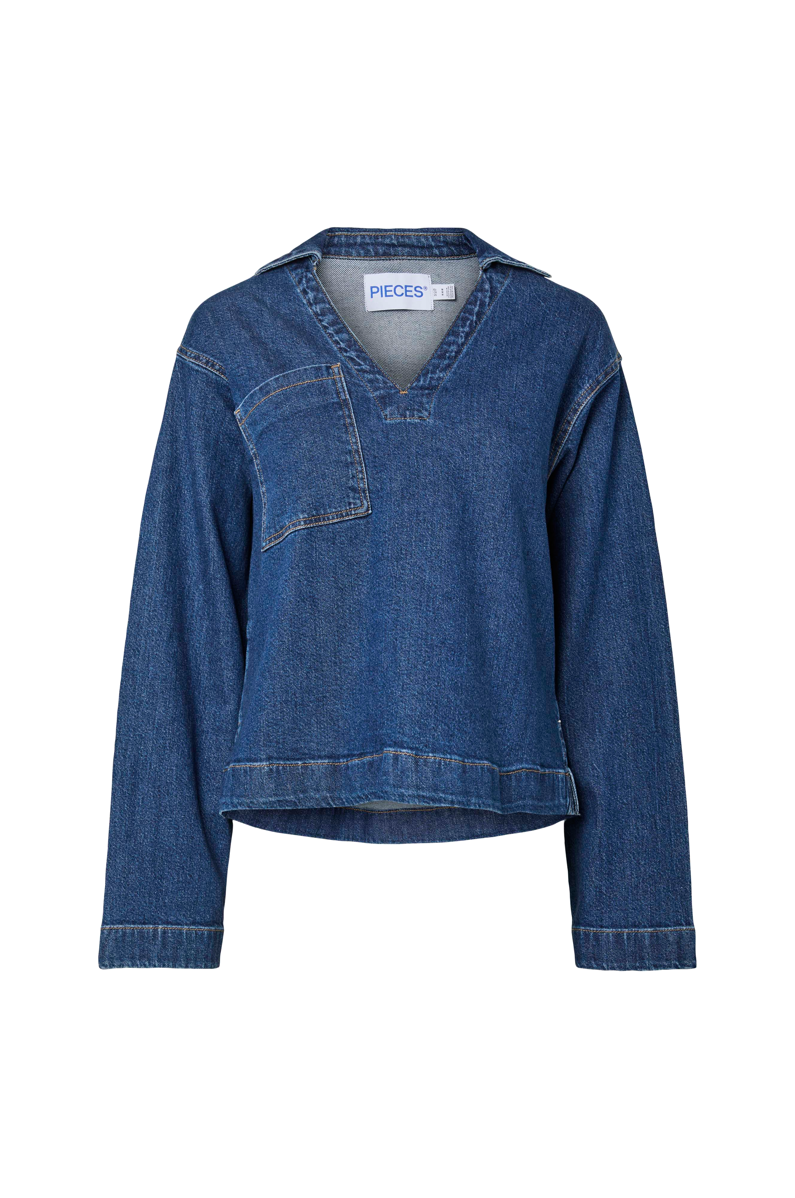 • Langermet bluse i denim med løs passform• V-formet hals med krage• Brystlomme• Skjær nede i sidene