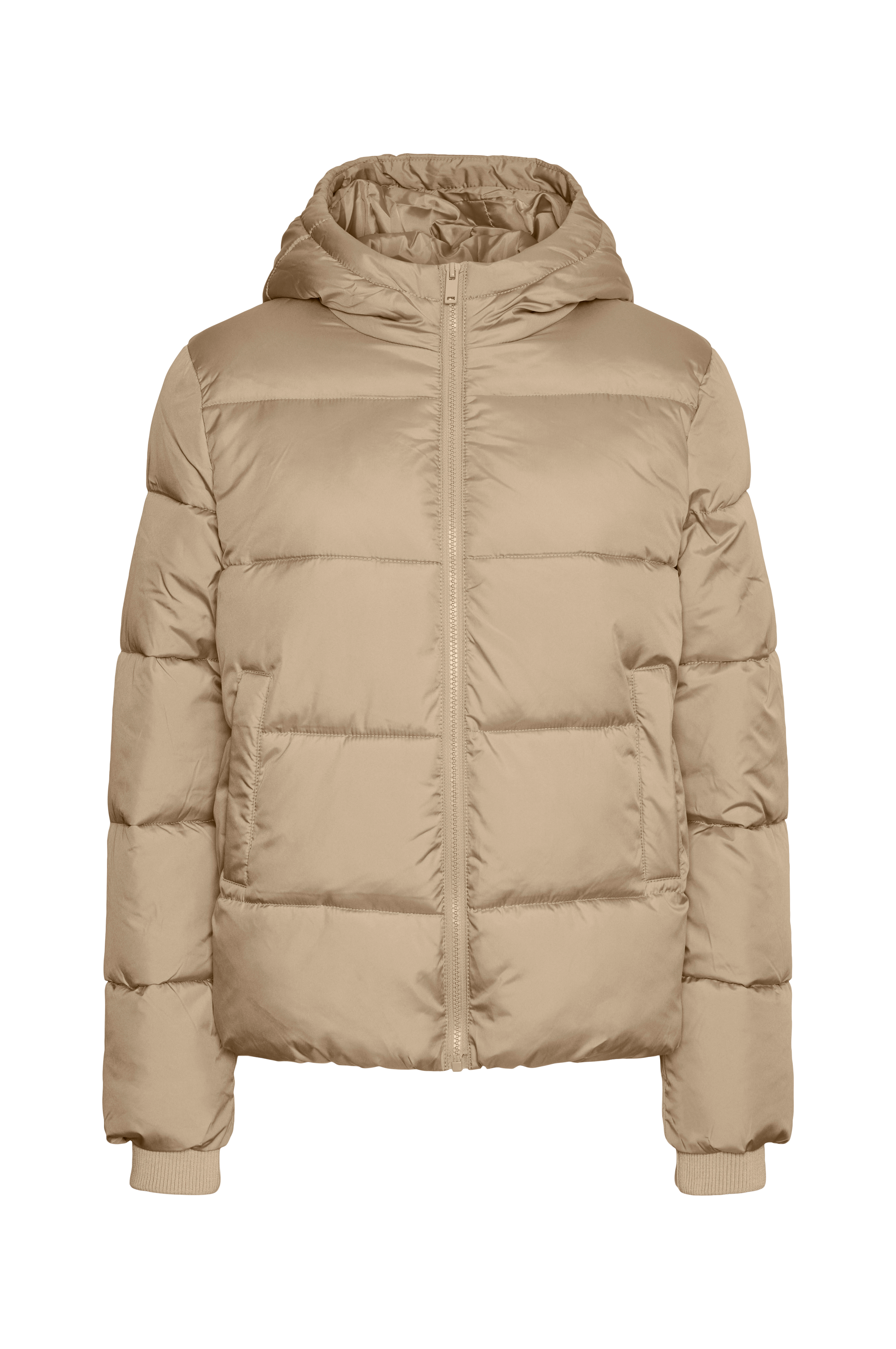 Quiltet og vattert boblejakke med fast hette. Glidelås og to lommer. Vrangbord i ermekantene og strikk i nederkanten.