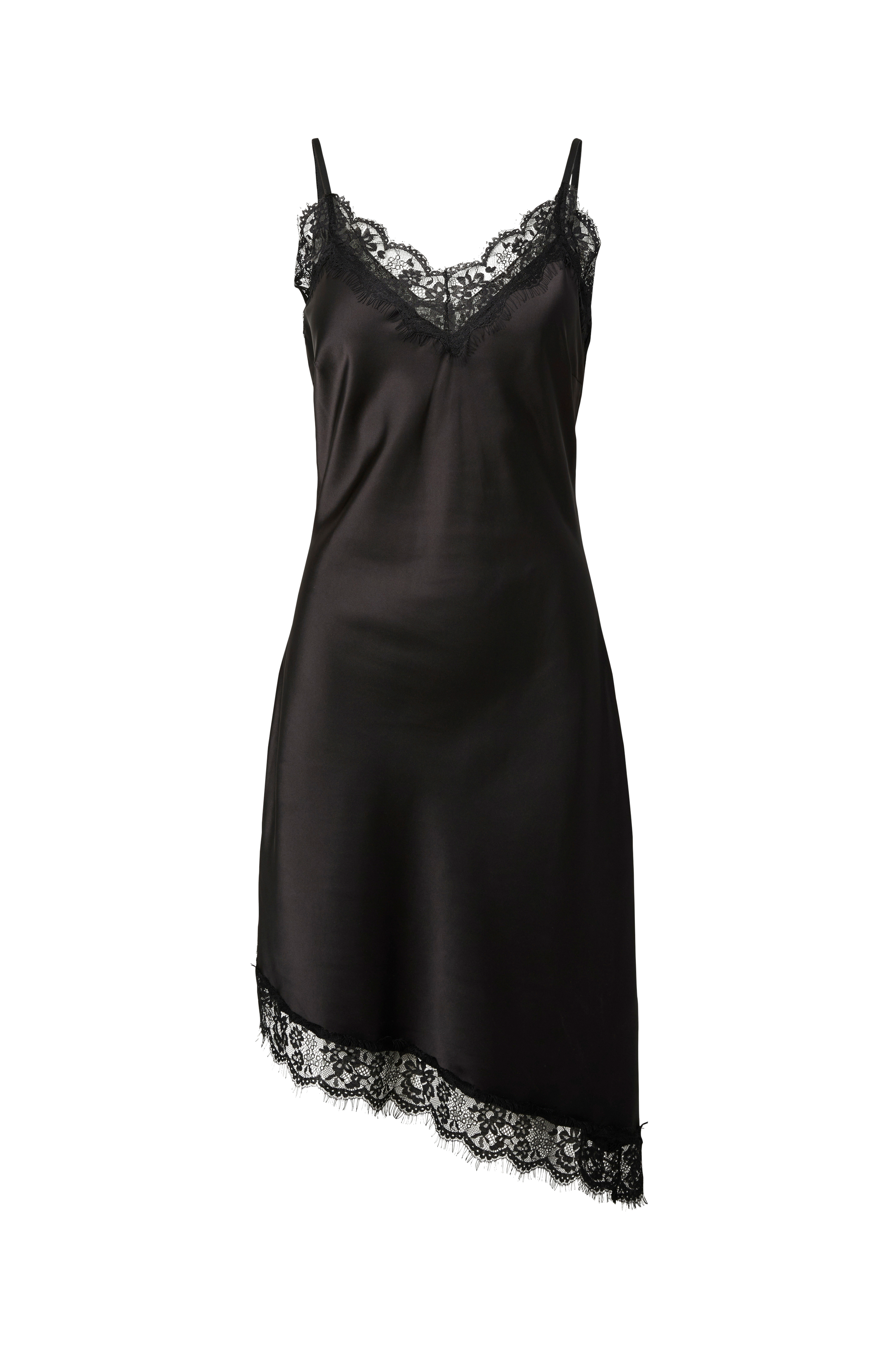 • Ermløs kjole i sateng med blonder på toppen og på bunnen• Tynne, justerbare skulderstropper• V-formet hals• Asymmetrisk hem• Lengde: 72/97 cm i størrelse S