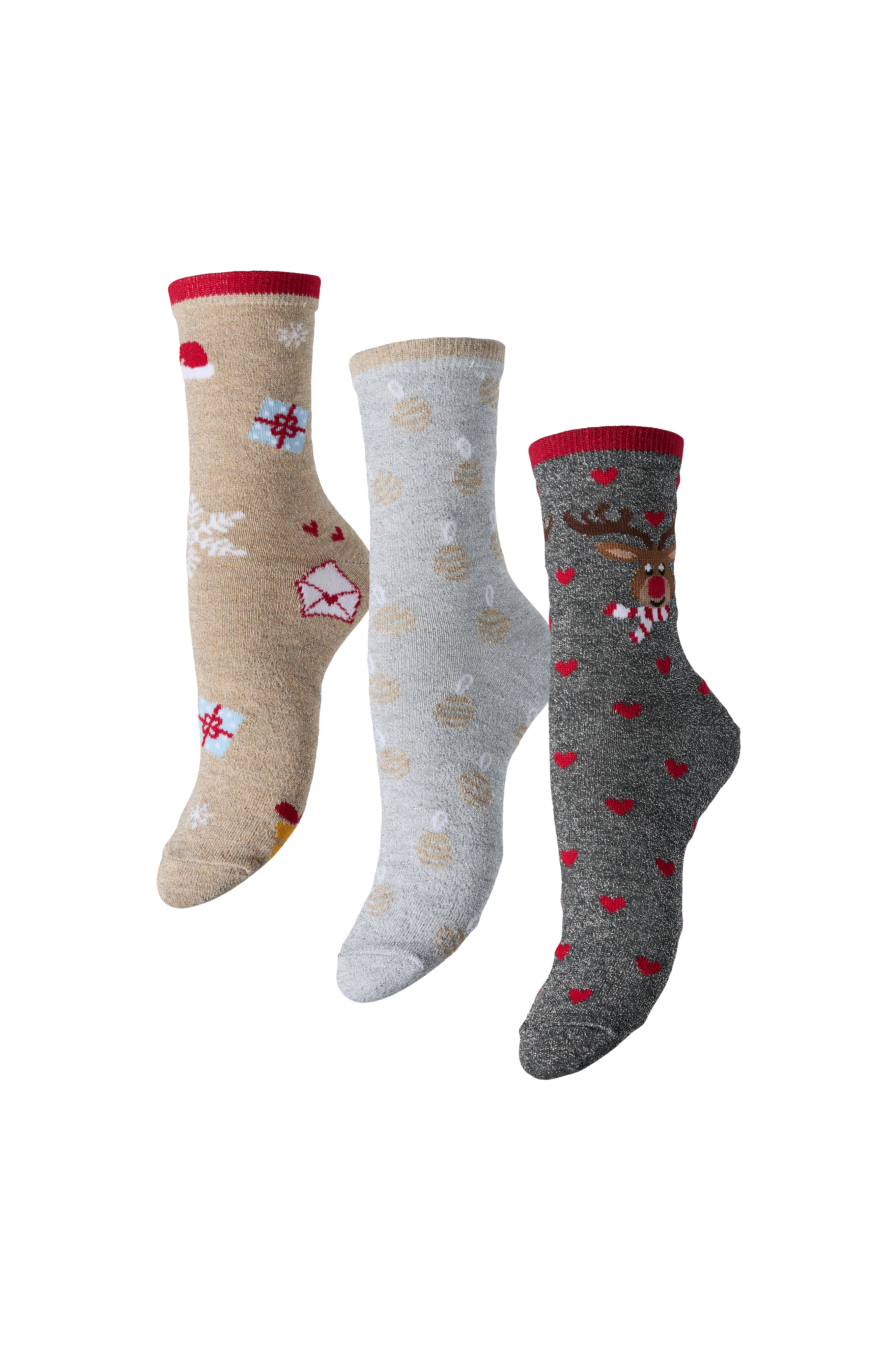 • Glitrende sokker med julemotiv• Ribbestrikket pynt på toppen• 3-pakning