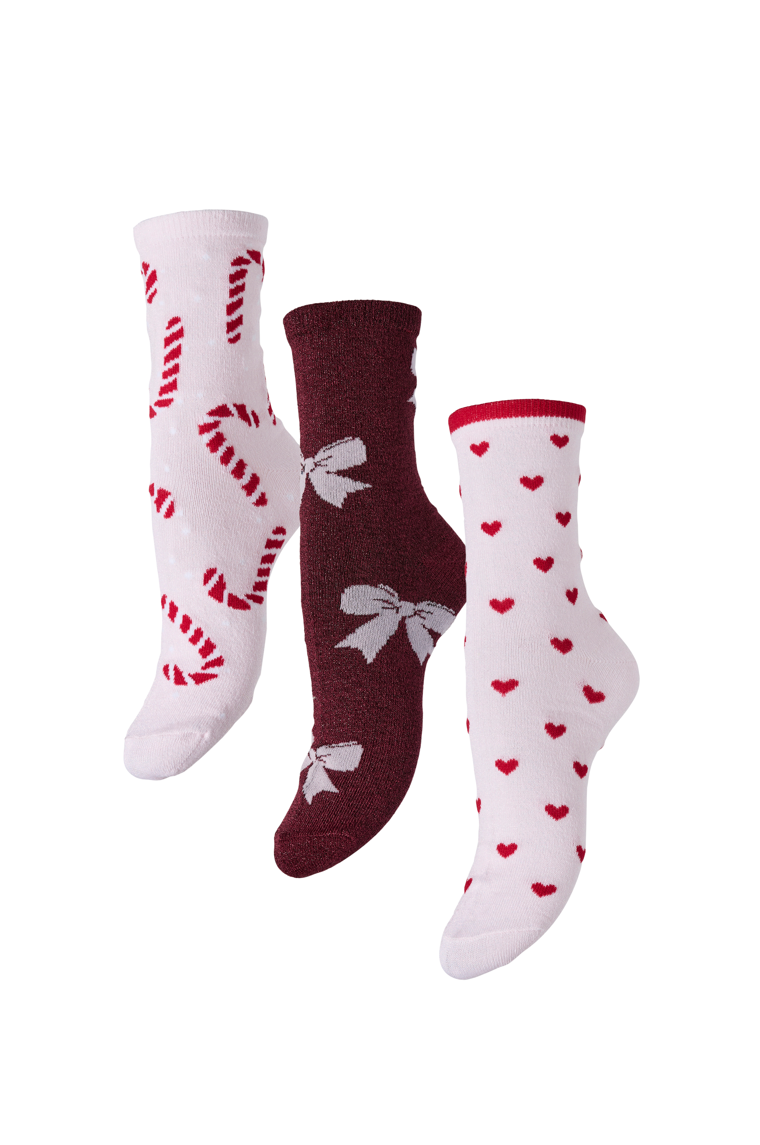 • Glitrende sokker med julemotiv• Ribbestrikket pynt på toppen• 3-pakning
