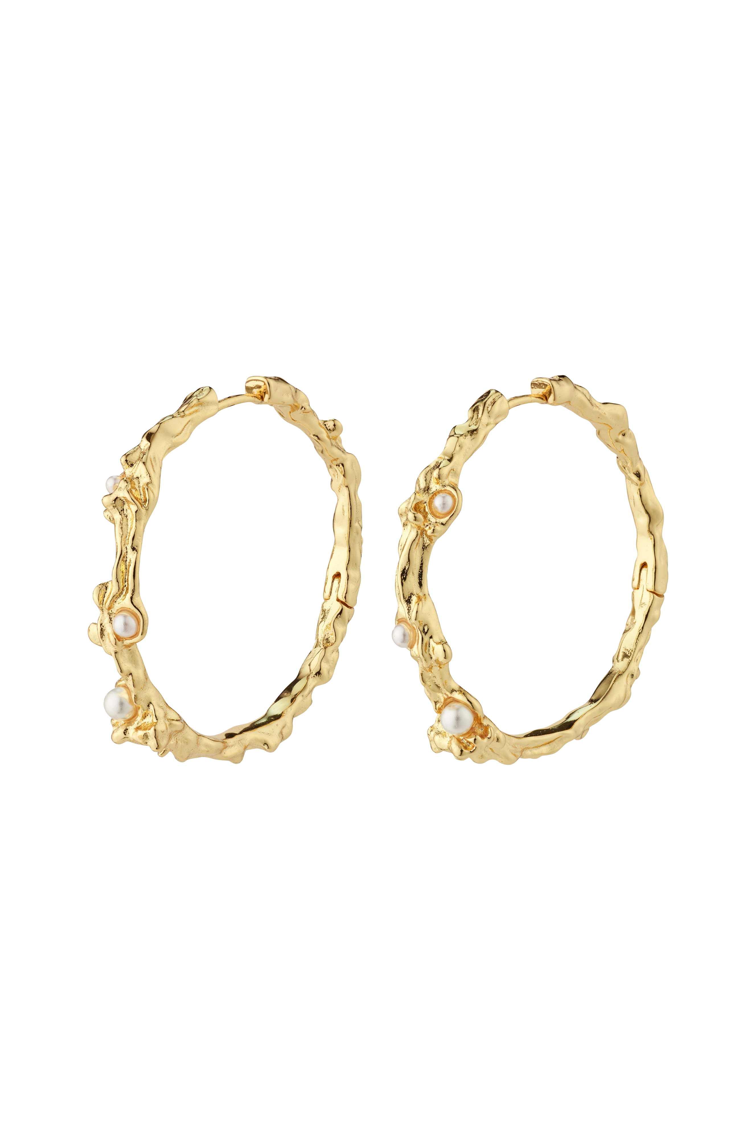 Skap din egen stil med de gullbelagte Raelynn hoops som har en personlig og leken energi. Øredobbene har et organisk formet design med en deilig håndlaget følelse, toppet med små hvite perler som skaper en sommerlig og luksuriøs stemning som du enkelt kan style med sesongens lettere styles. Miks og match med flere tilbehør for en personlig high-end styling som får deg til å skinne. Et sett øredobber laget av 97 % resirkulert materiale med omtanke for miljøet.