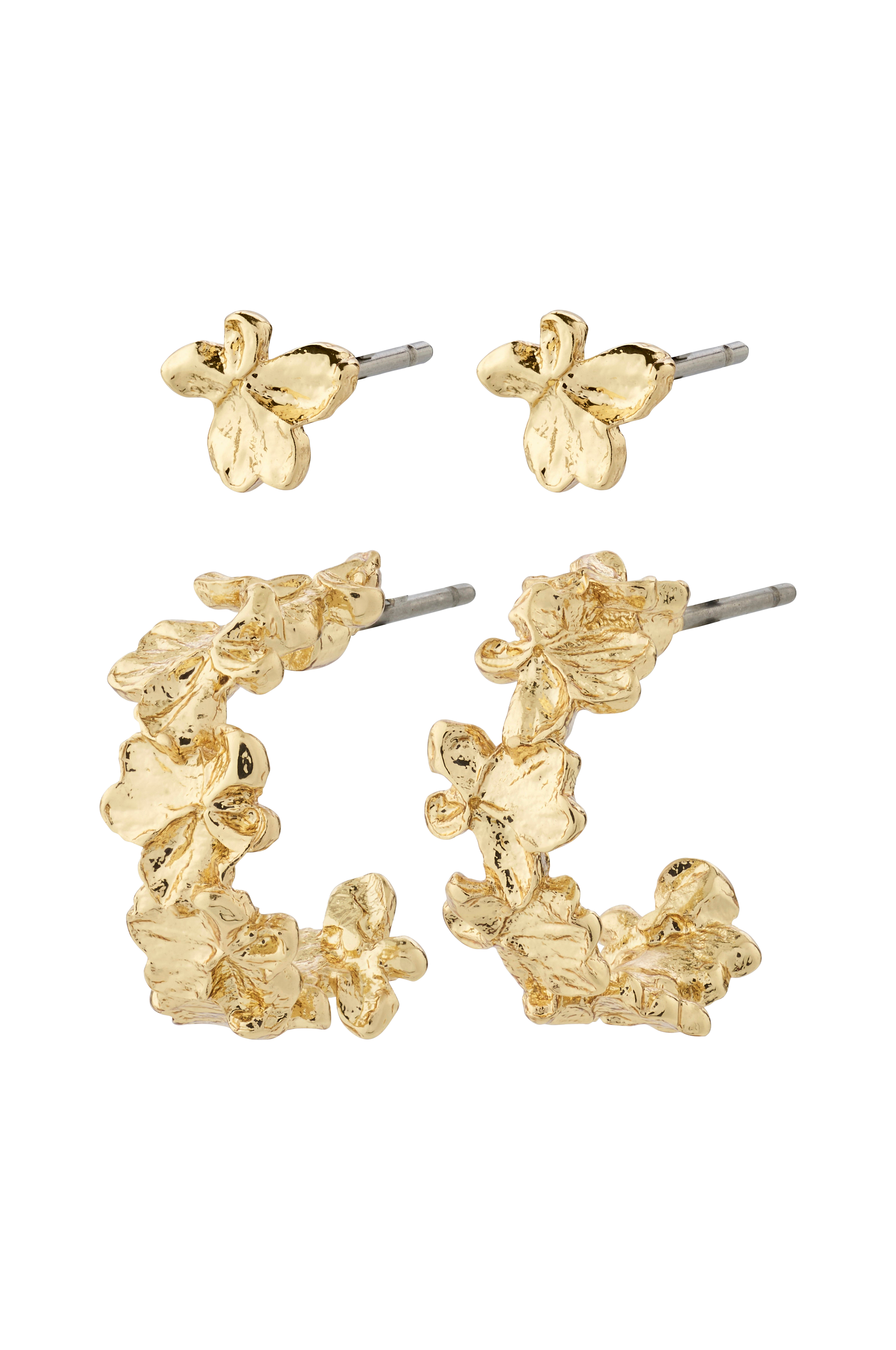 Gullskatter for din stil! Innta verden med de gullbelagte, organisk formede Zhuri øredobbene fra Pilgrim, der du får et 2-i-1-sett. Et sett med halv-hoops med blomstersilhuetter og et sett med casual, små blomsterstifter. La de vakre blomstermotivene være prikken over i-en på antrekket ditt, og bruk dem sammen eller hver for seg avhengig av stylingen din. Zhuri 2-i-1-settet er laget av 97 % resirkulert materiale.