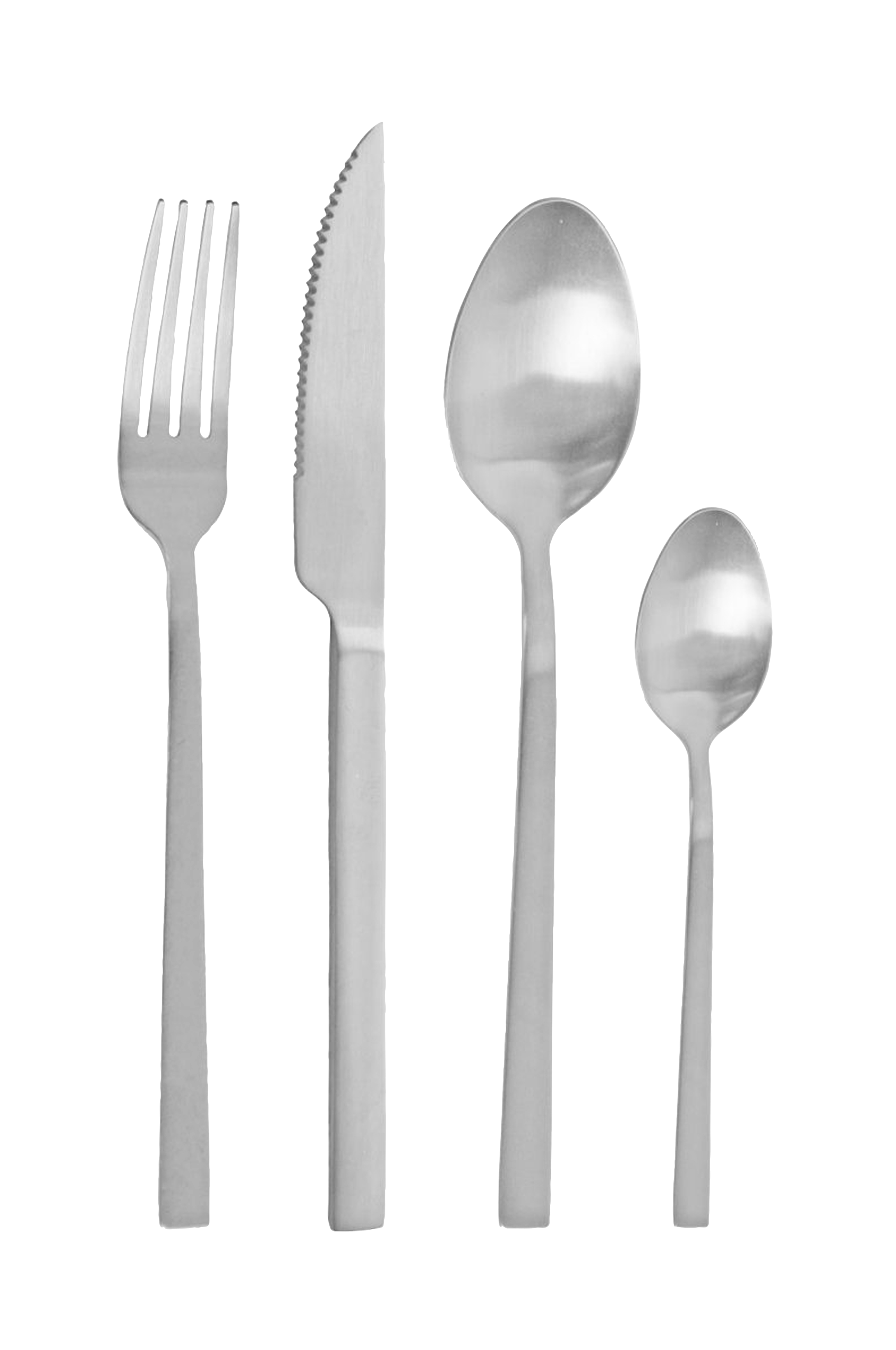 Komplett sett med matgyldent bestikk i rustfritt stål for 6 personer. Settet består av 24 deler og inneholder skje, gaffel, kniv og kaffeskje. Har et stilrent, moderne design som passer både til det enkle og det overdådig dekkede bordet.