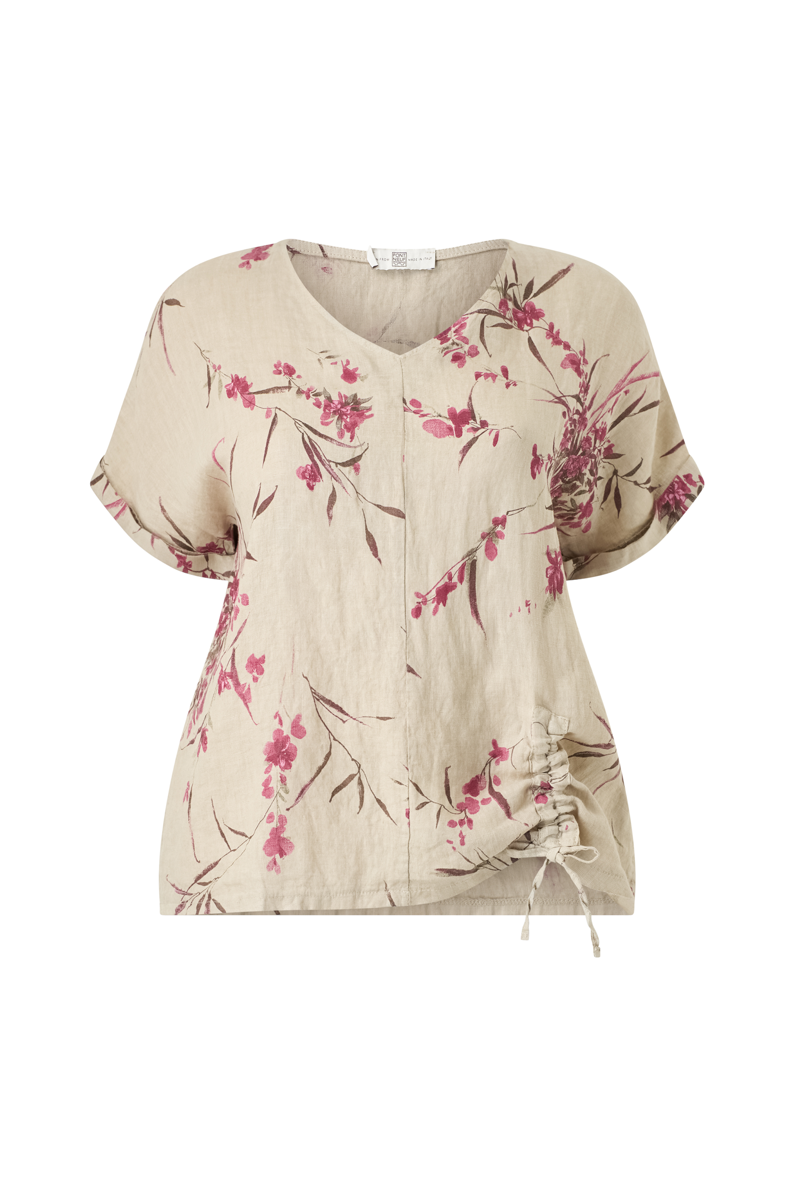 • Bluse i lin• V-hals• Korte ermer• Sydde ermeender• Snøring nedtil på ene siden• Pluss-størrelser