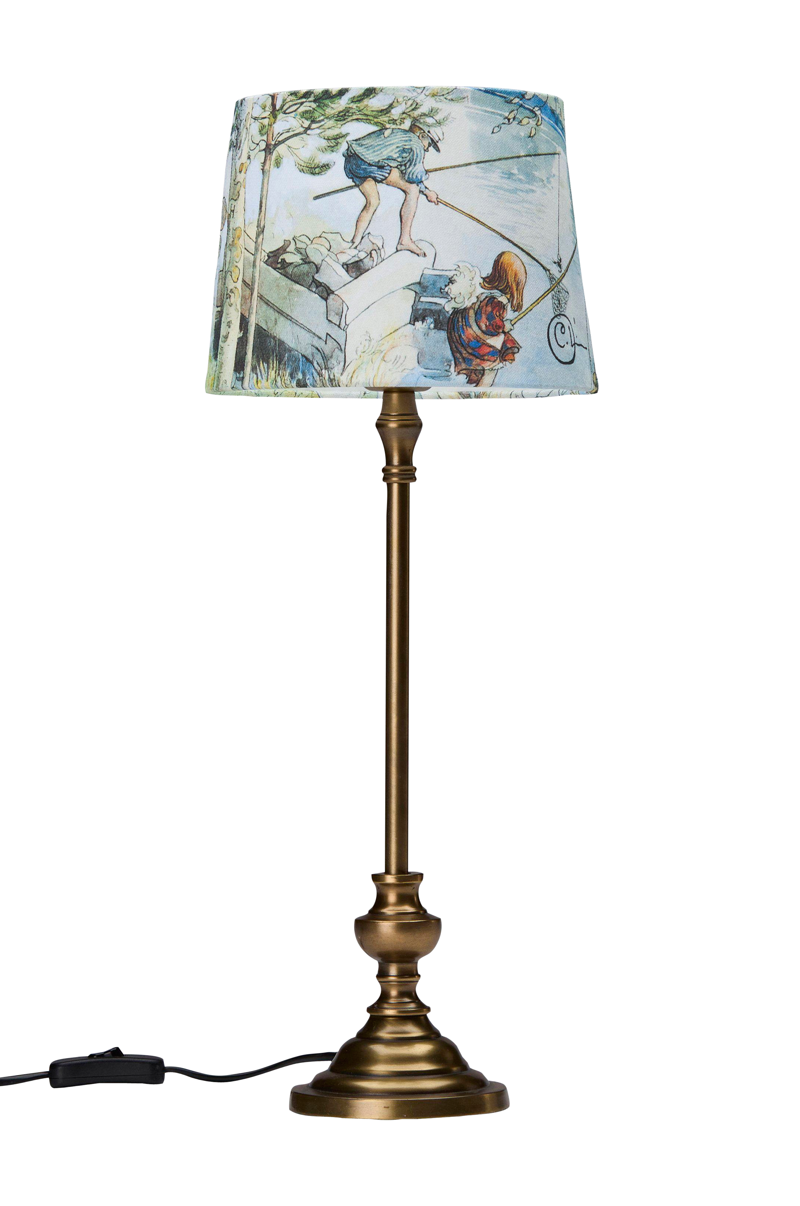 Bordlampe Andrea, trykket på skjermen kommer fra kunstneren Carl Larssons malerier. Skjermen har lys innside og rullede kanter for å forsterke trykket. Formen er lett skrå og har E27-feste. Svart 1,5m plastledning med strømbryter ca. 30 cm fra lampen.