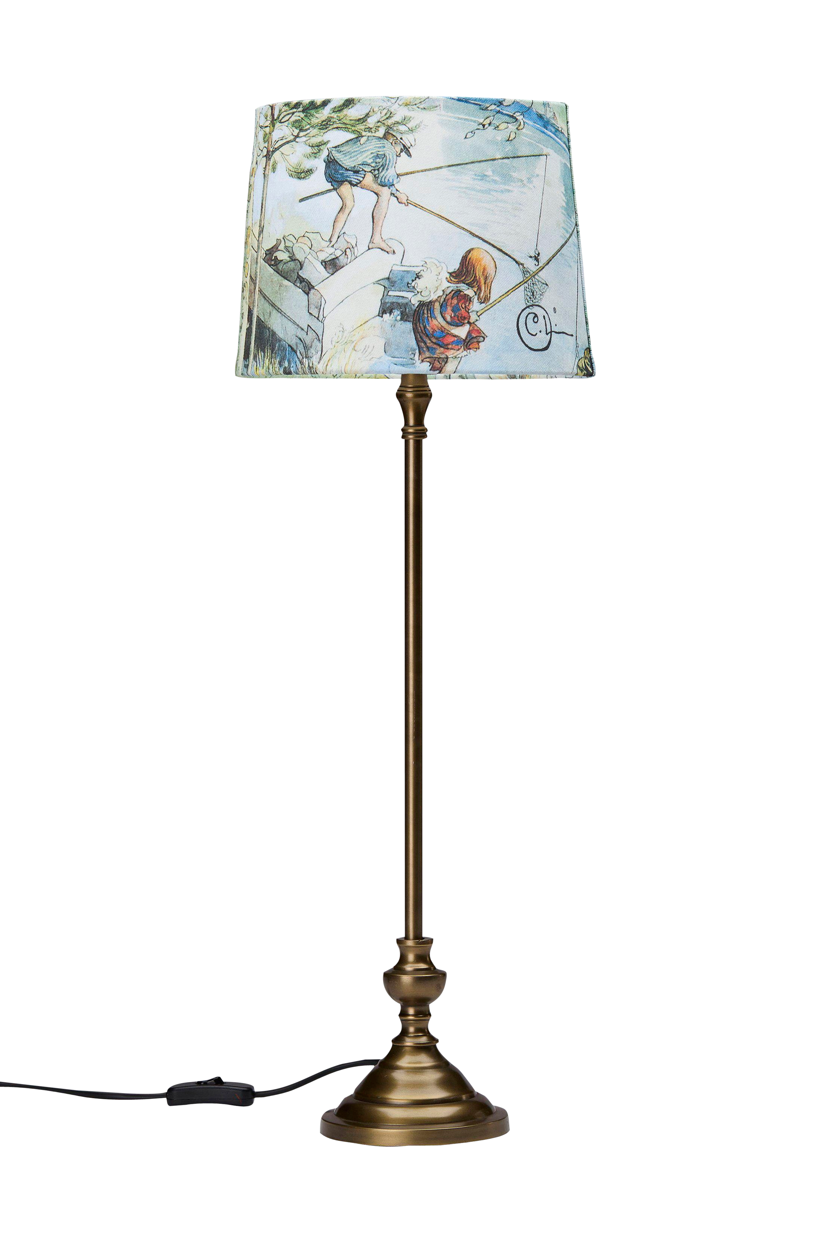 Bordlampe Andrea, trykket på skjermen kommer fra kunstneren Carl Larssons malerier. Skjermen har lys innside og rullede kanter. Formen er lett skrå og har E27-feste. 1,5 m plastledning med strømbryter ca. 30 cm fra lampen.
