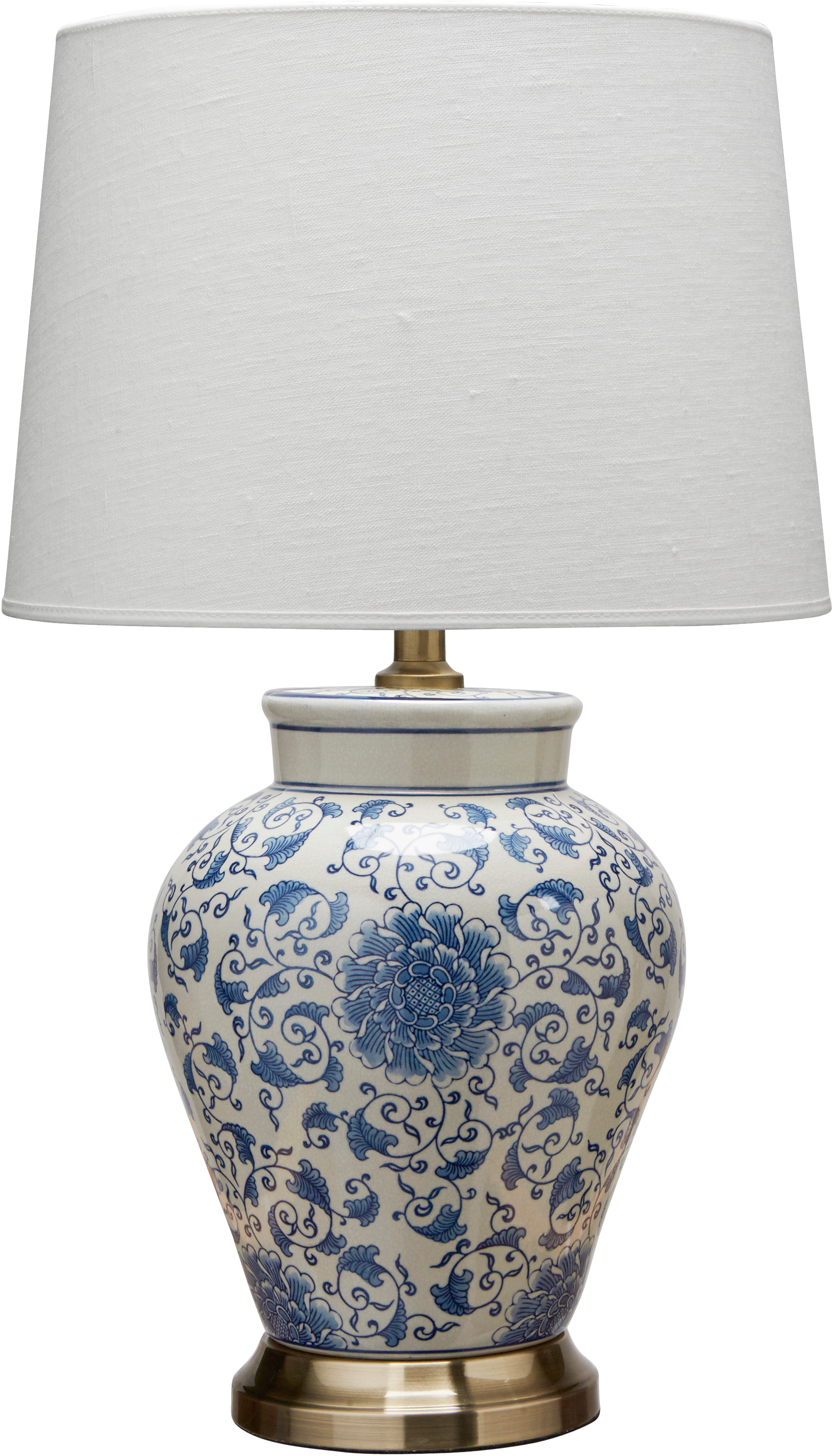 Bordlampe Fang Hong i porselen. Høyde 38 cm, diameter 22,5 cm. Messingdetaljer ved fot og sokkel. E27, maks 40w. Svart tilkoblingsledning. Inklusive Sofia lampeskjerm i offwhite. Høyde 25 cm, diameter 35/30 cm. E27.