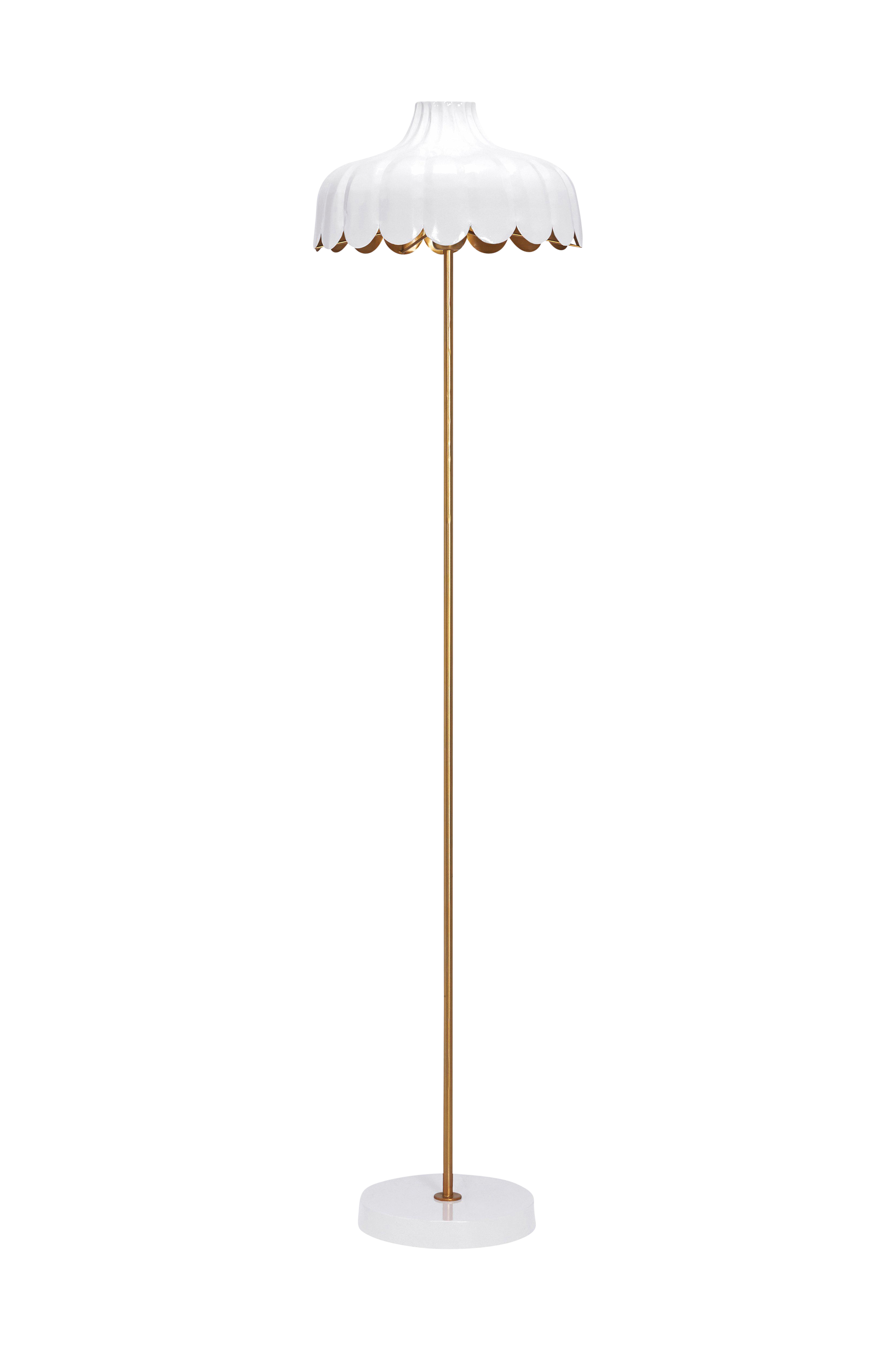 Gulvlampe Wells er håndlaget av metall. Inspirert av en blomst gir denne lampen hjemmet en romantisk stil. Den gullfargede innsiden sprer et varmt lysskinn i rommet. Lampefoten har gulvstrømbryter og svart plastledning som er 180 cm. Wells er tilpasset lyskilder med E27-sokkel og maks effekt 25W. Høyde 150 cm, bredde 35 cm, dybde 35 cm.