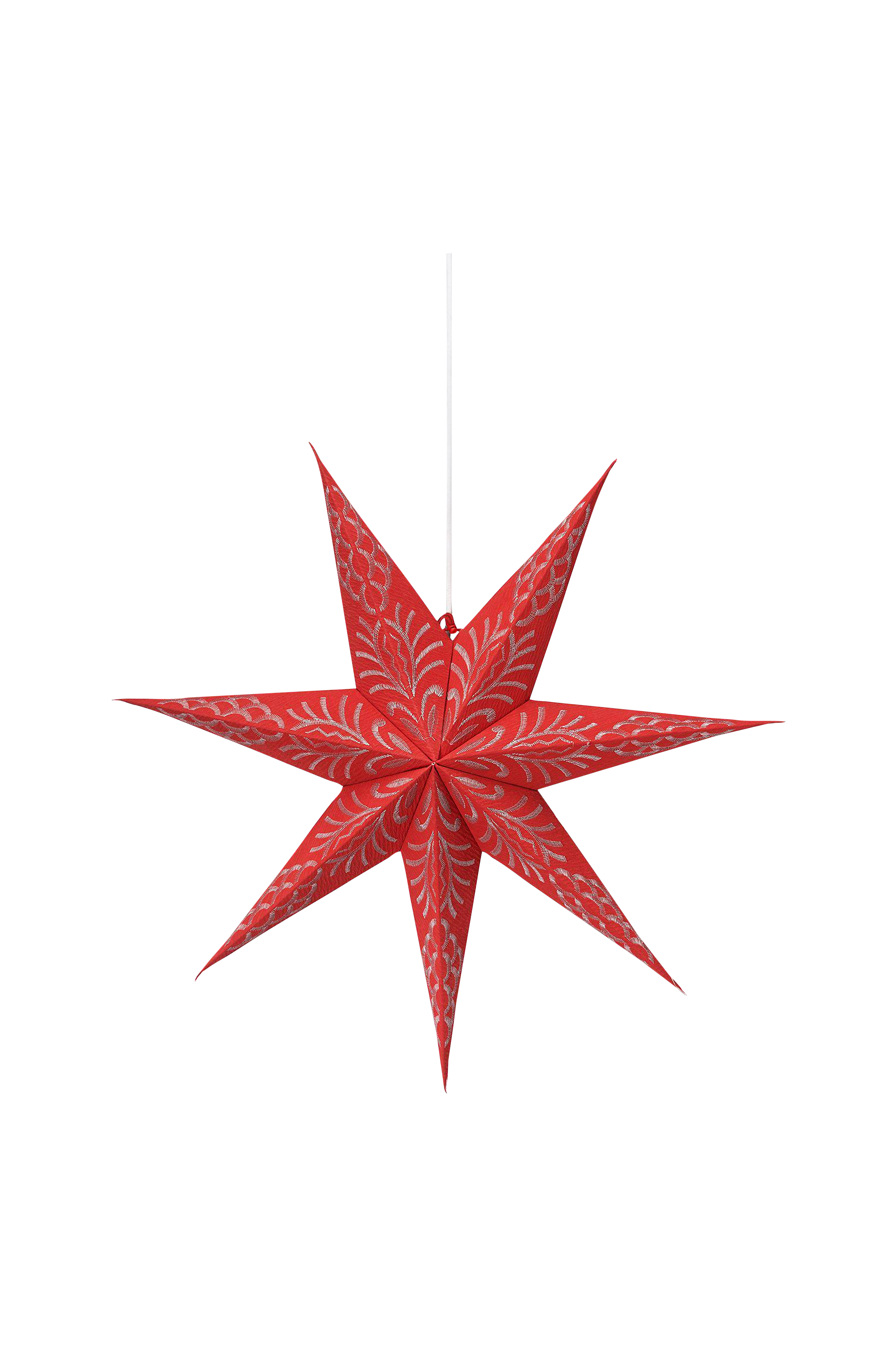 Julestjerne i papir av en litt kraftig kvalitet med broderi i kontrastfarge. Stjernen lukkes med bånd og snøring. Kjøp også E14 ledningssett og lyskilde, maks 25W.