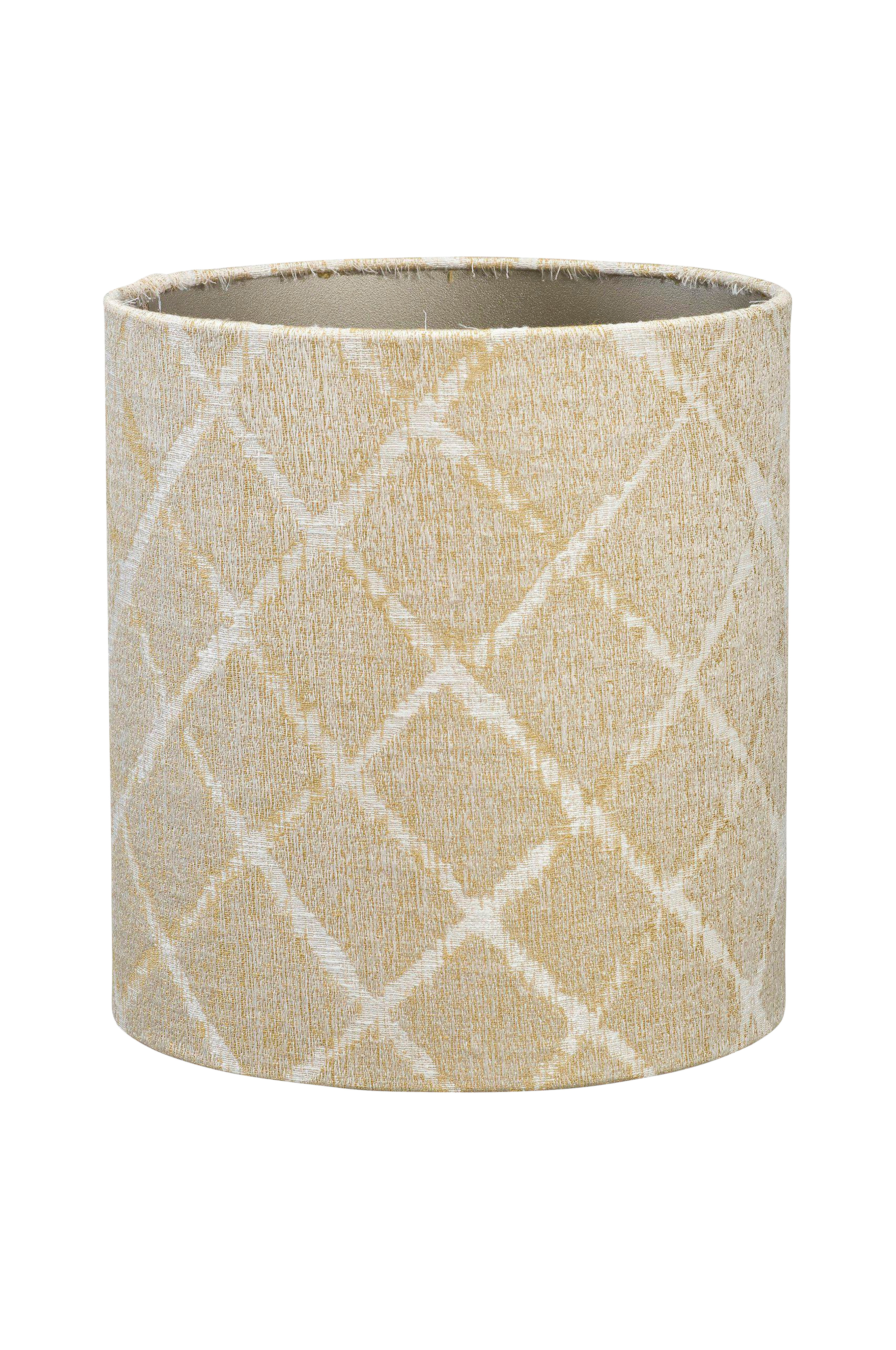 Sylinderformet skjerm i jacquardvevd stoff med silkelook. Skjermen har gullfarget innside med fargestemt stamme. Lampeskjermen har et E27 ringfeste som sitter ca. 3 cm fra nederkanten. Høyde 21,5 cm og diameter 20 cm.
