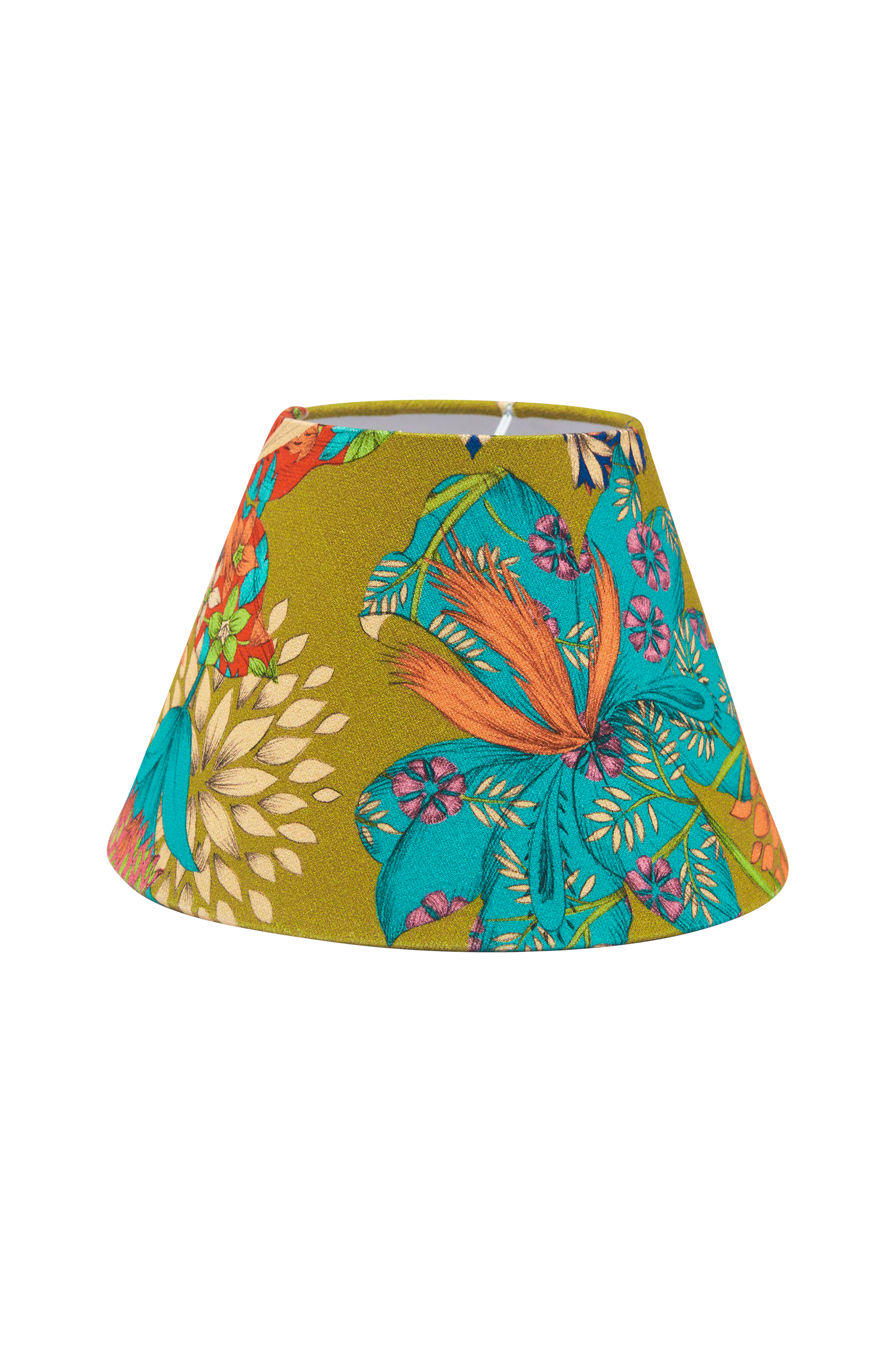Lampeskjerm Empire i et mønstrete stoff. Skjermen gir et luksuriøst inntrykk med fint lysskinn, og passer til gulvføtter med E27-holder. Benytt gjerne en opal lyskilde som gjør at lyset strømmer fint i hele skjermen. Skjermen har E27 ringfeste. Lyspære E27 kjøpes separat. Høyde 27 cm, bredde nederst 50 cm, bredde øverst 22 cm.