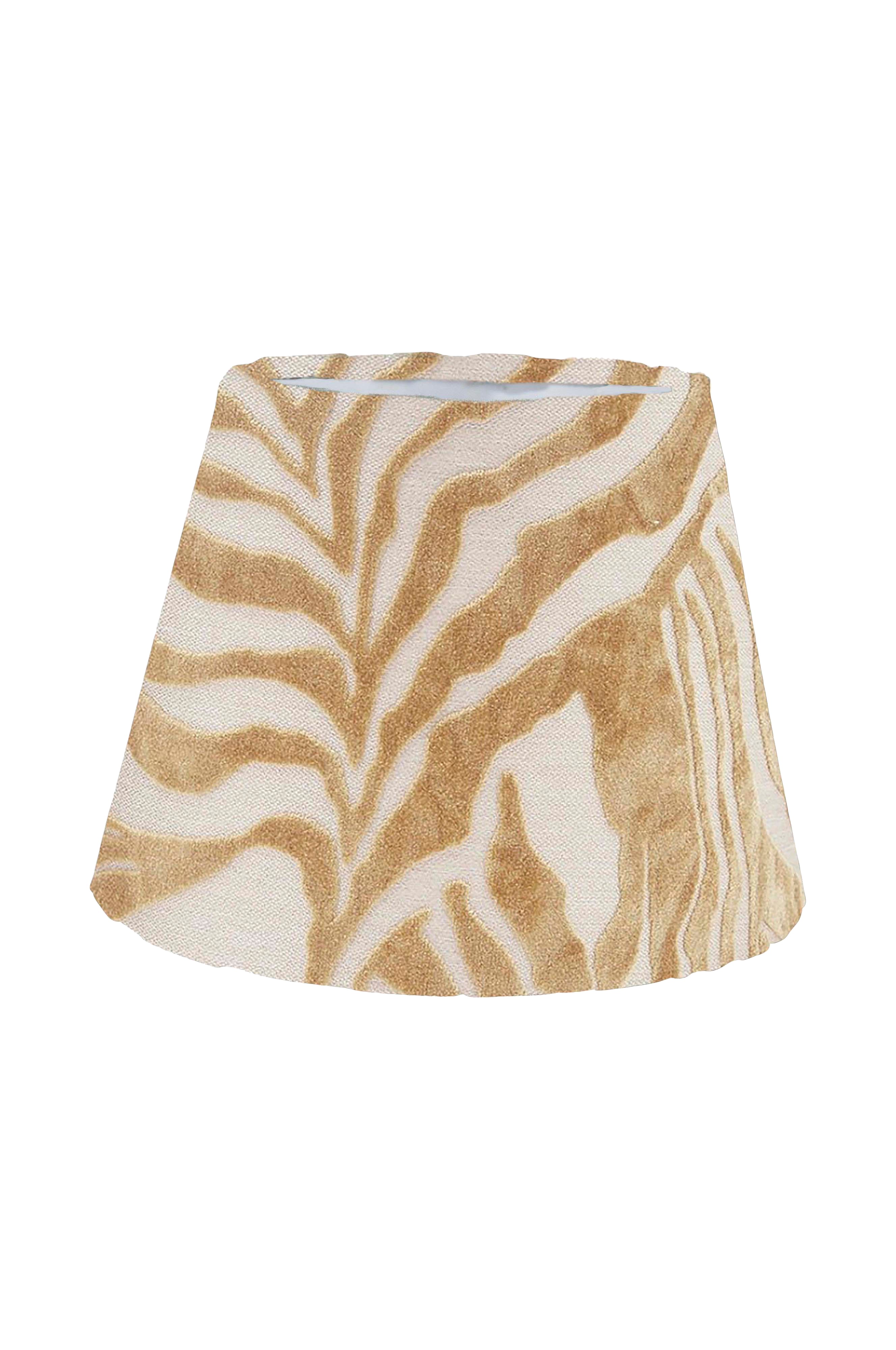 Hanna lampeskjerm har rullede kanter og innbrettet skjøt som skaper en luksuriøs følelse av praktfullt håndverk. Formen er lett skrånende og har hvit laminat som gir et fint lysskinn når lampen er tent. Skjermen har E27-ringfeste som sitter ca. 4,5 cm fra bunnen. Høyde 14 cm, bredde nederst 19 cm, bredde øverst 12 cm.