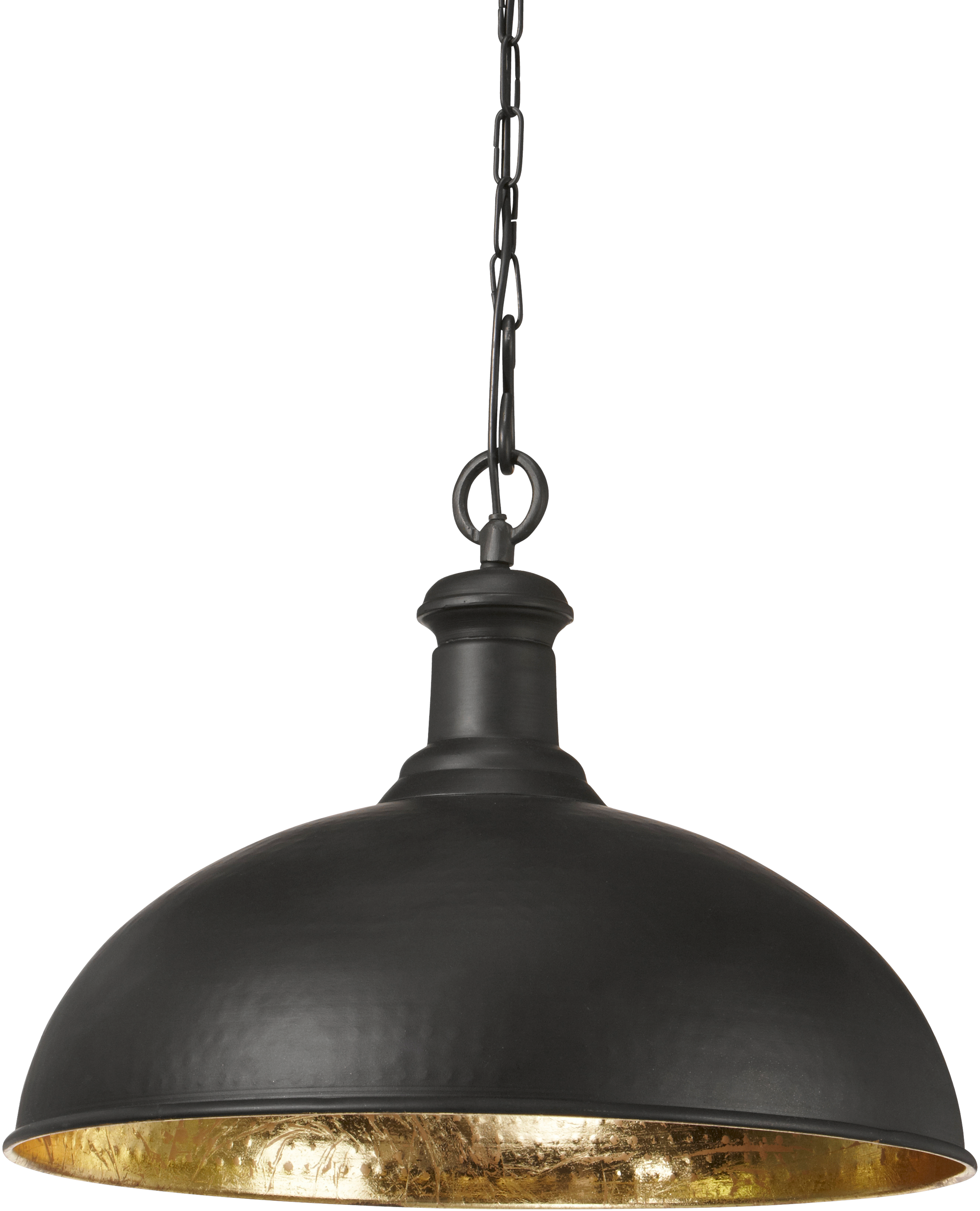 Taklampe i metall, komplett med kronkontakt. Takkopp i metall med feste for takkrok. Svart med gullfarget innside. 70 cm i diameter, høyde 53 cm. Ledningslengde 100 cm. E27 maks