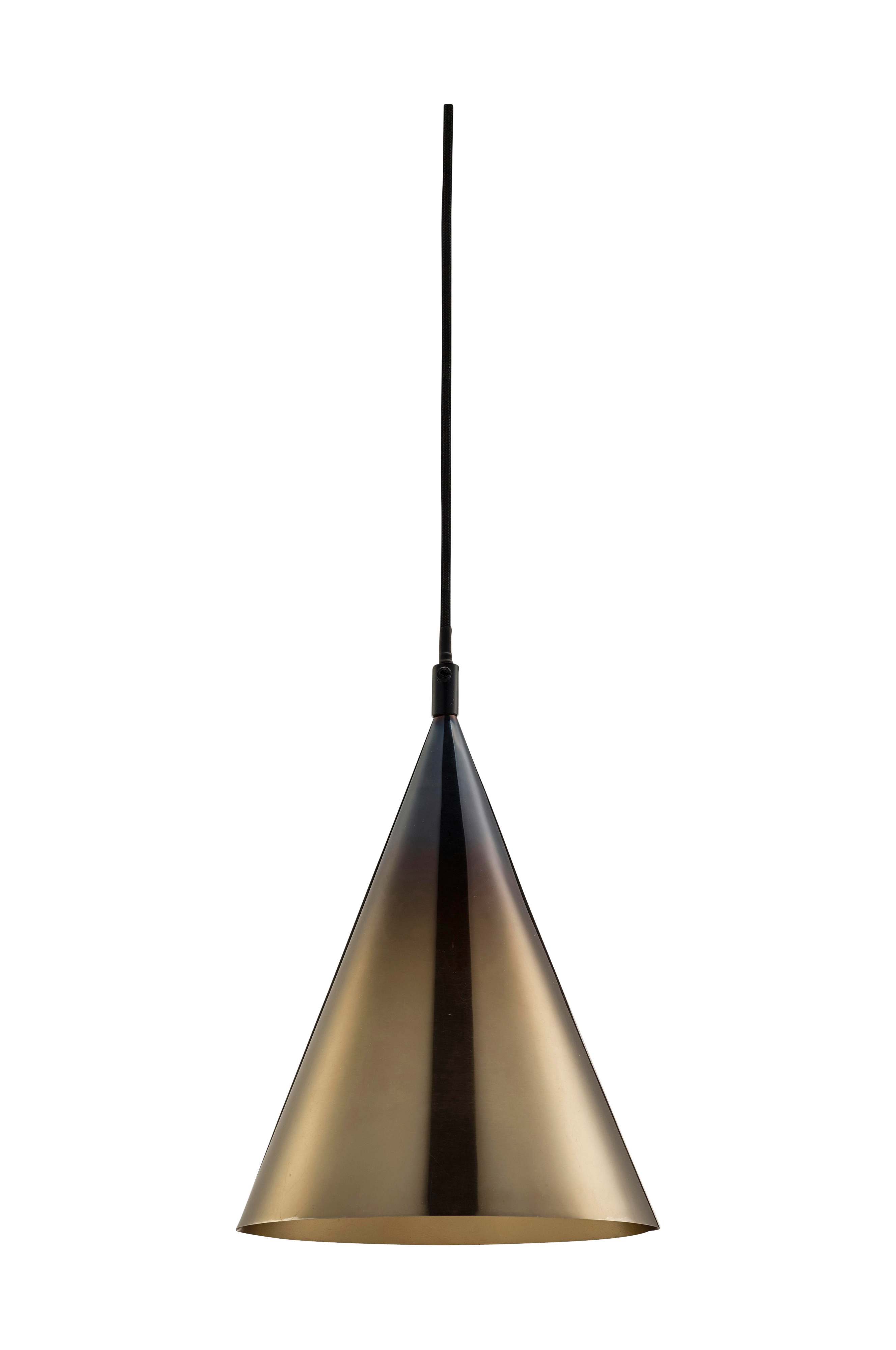 Taklampe Hyde inngår i en lampeserie med en litt mer moderne følelse med rene linjer og form. Størrelsen passer f.eks. over kjøkkenbenken. Man kan også henge flere i gruppe over et bord. Håndlaget metallskjerm som skifter i farge fra lys brun til nesten svart. Fargen kan variere noe fra produkt til produkt. Innside i gullfarge. E27 lampesokkel. Høyde 28 cm og diameter 20 cm. 1,6 meter svart tekstilkledd ledning med takkopp for krokoppheng. Takkontakt kjøp separat. Lyspære er ikke inkludert. Ikke jordet.