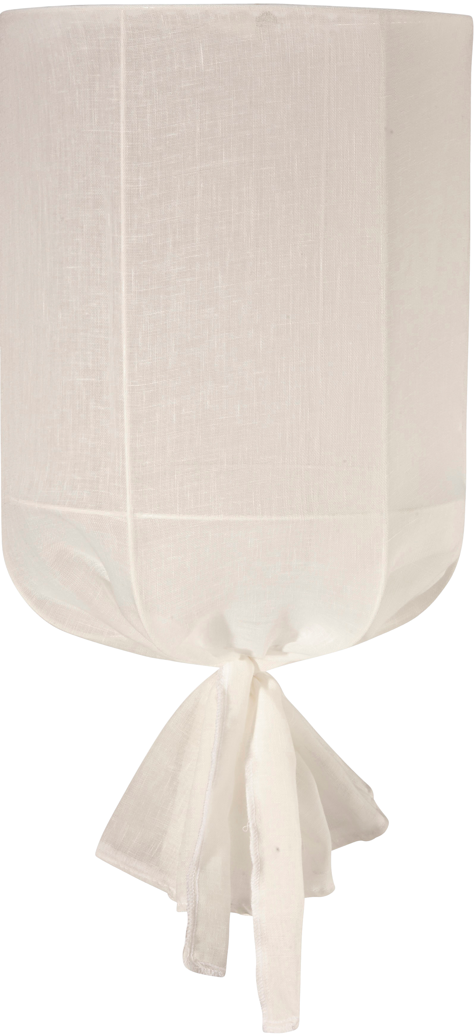Taklampe i stoff. Rund, diameter 30 cm, total høyde 60 cm inkludert hengende knute. Inkludert hvit ledning, lengde 1,2 m. Takkopp i hvit plast. E27. Maks 60W.