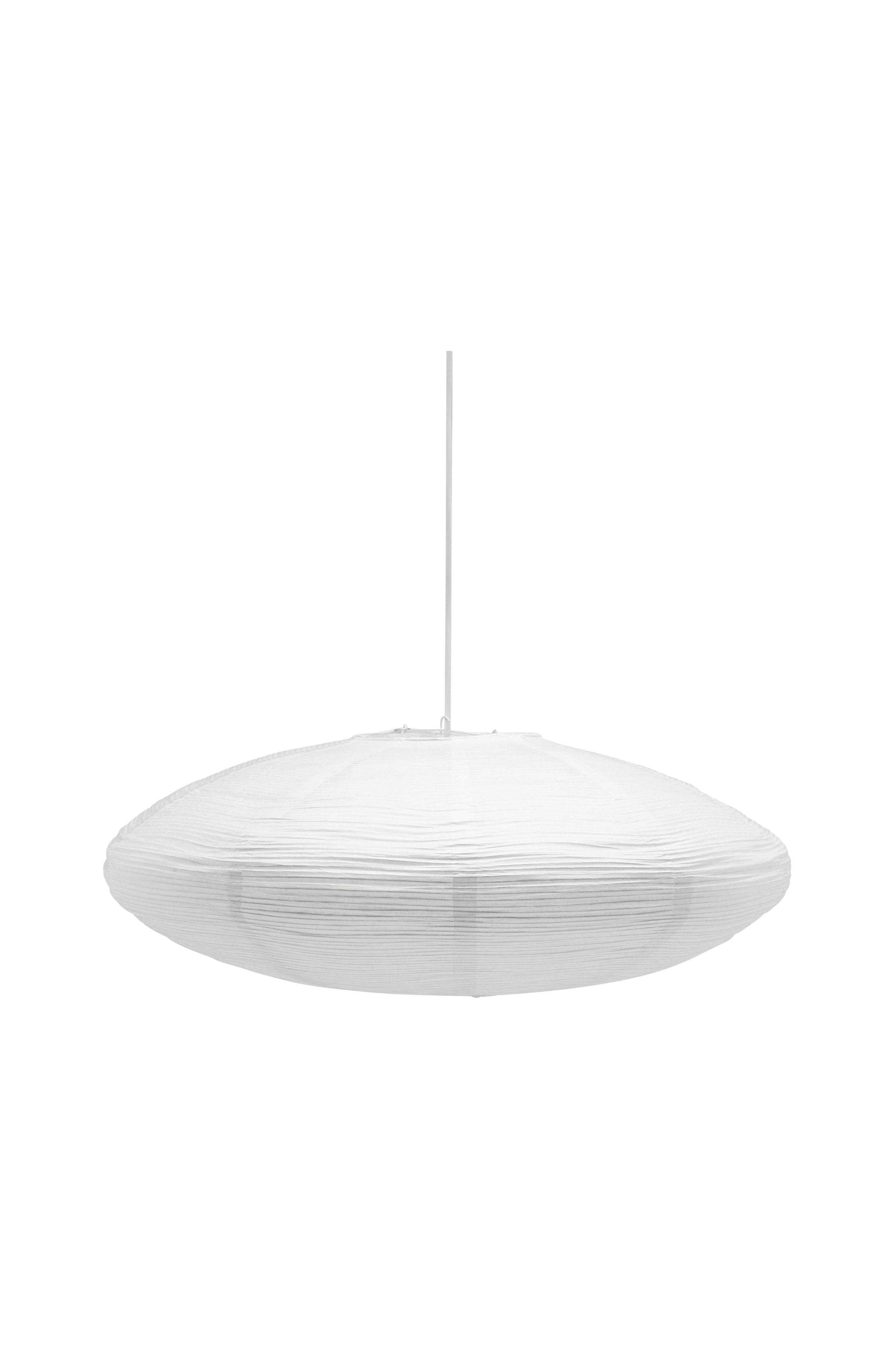 Rispapirskjerm Yuni med tett, uregelmessig metalltråd som skaper et vakkert mønster. Yuni er ellipseformet, 60 cm i diameter og 23 cm høy. Spennes ut ved hjelp av en metallekspander som man også fester lampeledningen i. Takkontakt og lampeledning medfølger ikke. Både takkontakt og lampeledning kan kjøpes separat. Ikke jordet.