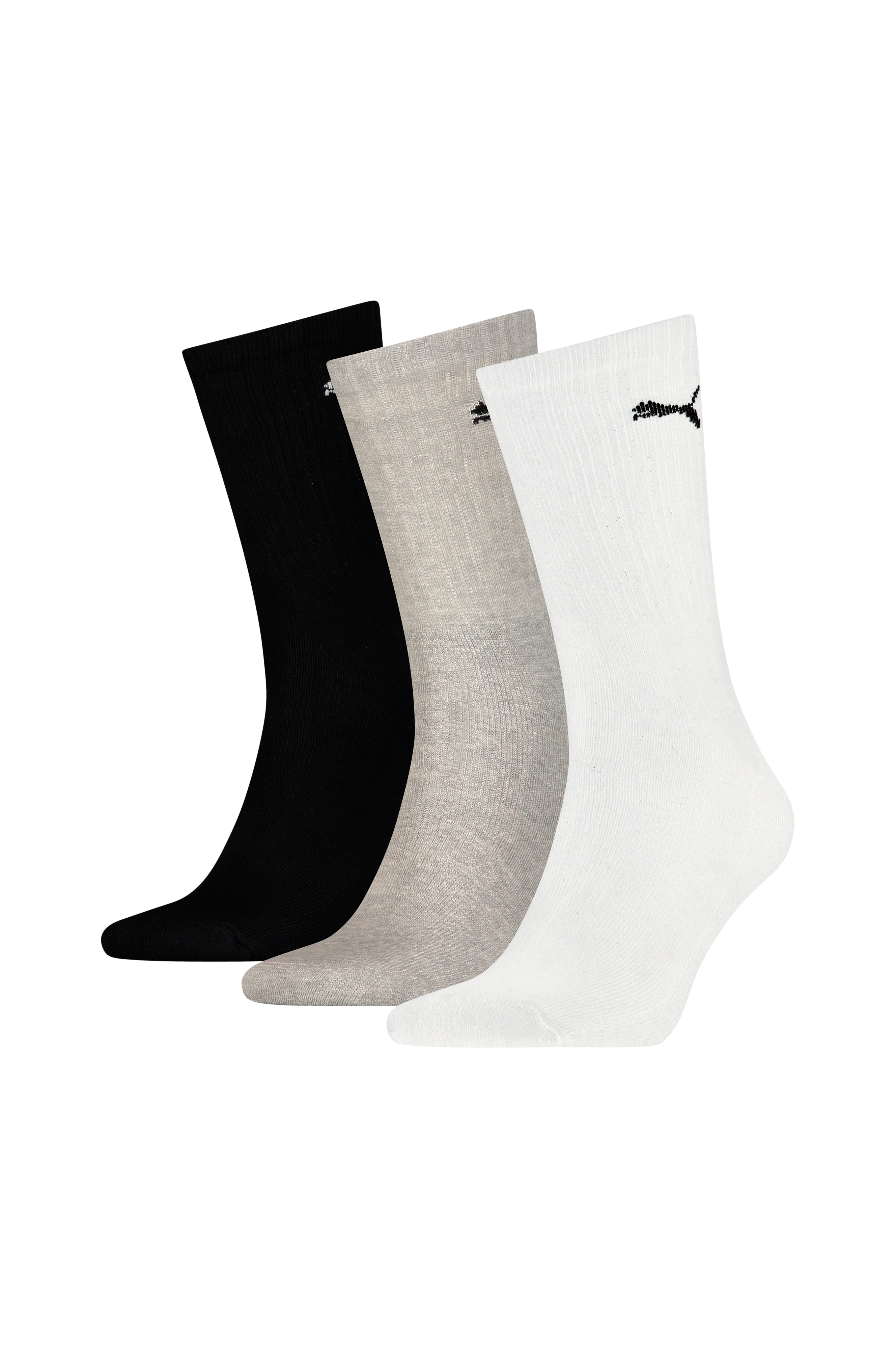 Sportssokker Puma Sport i 3-pakning fra Puma. Litt kraftig kvalitet med dempet såle og skaft med ribbestrikket kant og strikket Cat-logo. Flate tåsømmer reduserer faren for gnagsår.