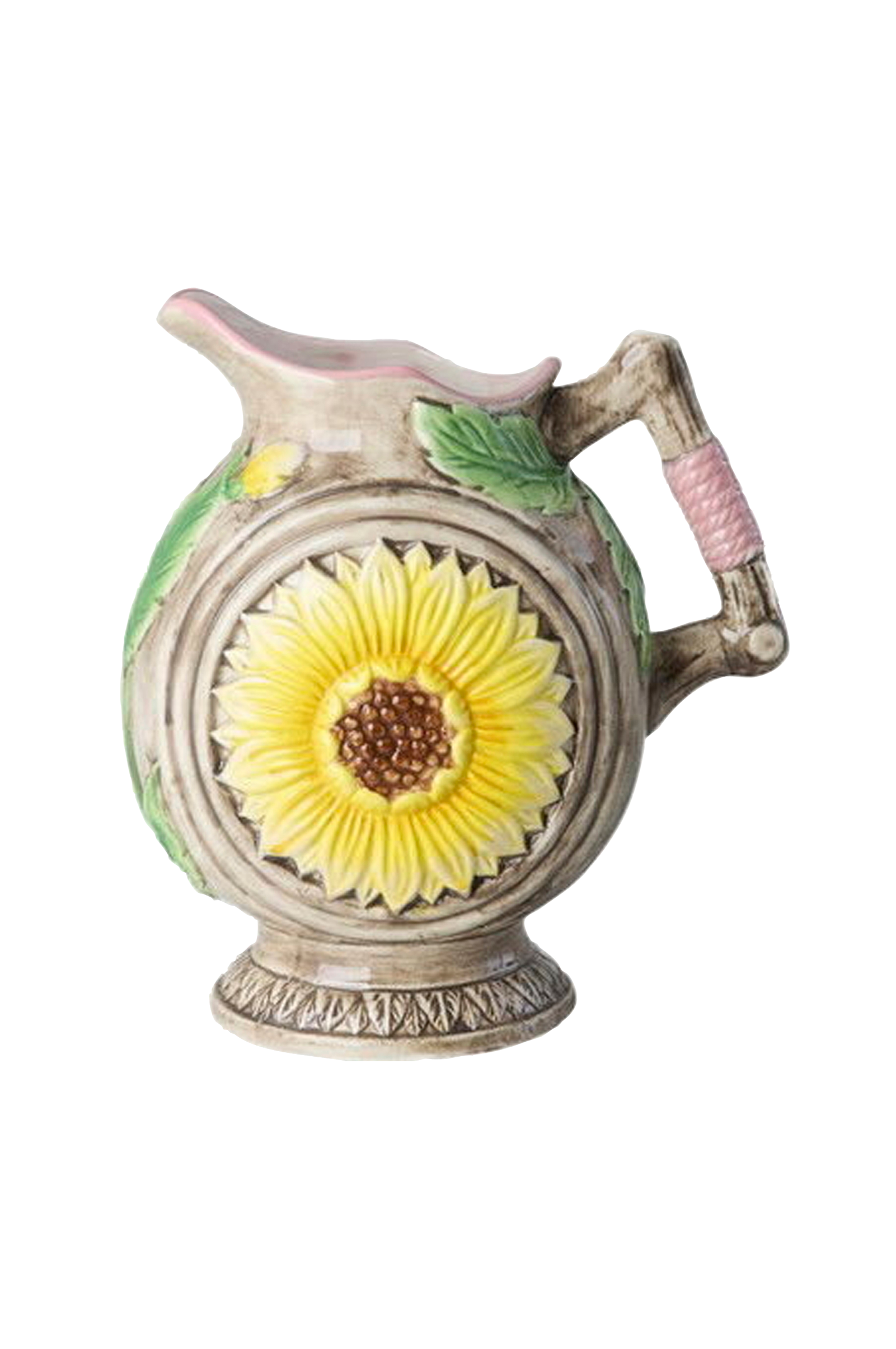 Nydelig og finurlig krukke med solsikker, blader og detaljer. Den er laget av keramikk og malt helt for hånd. Kannen rommer opptil 2,5 liter og passer til det meste. Vann til lunsj, juice til brunsj eller en god vin til middag ... eller du kan arrangere favorittblomstene dine i den og bruke den som vase!
