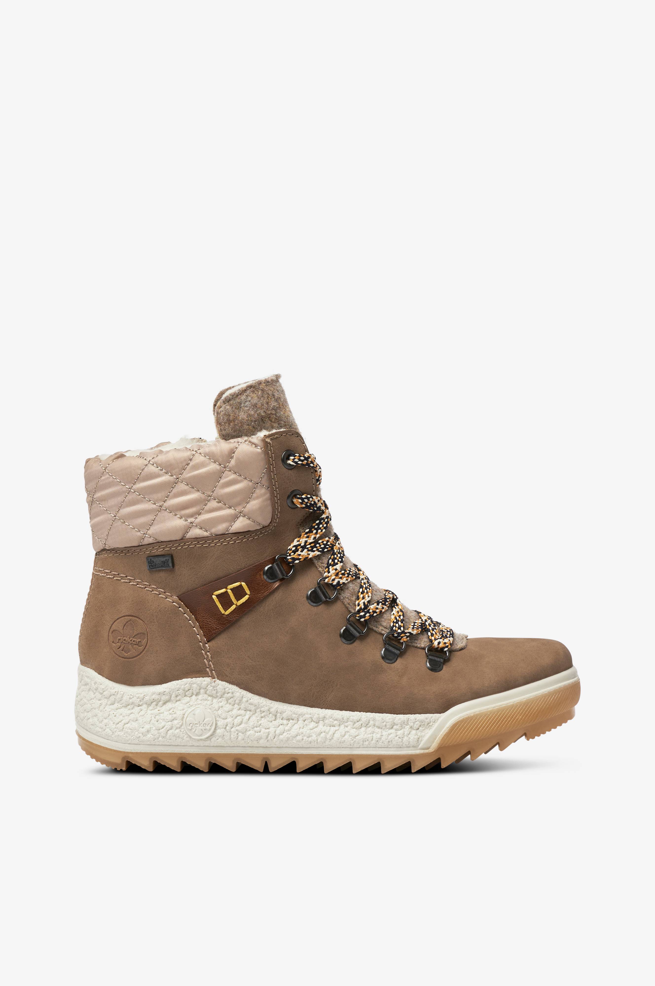 Støvler med overdel i skinnimitasjon og tekstil med snøring samt glidelås på innsiden av skaftet. Støvlene er varmfôrede i ull og utstyrt med Rieker-Tex, en membran som gjør skoene vannavvisende samtidig som den puster. Den fleksible antistress-sålen reduserer tretthetsfølelsen i føttene. Grovmønstret yttersåle med godt grep. Skafthøyde ca. 13,5 cm.