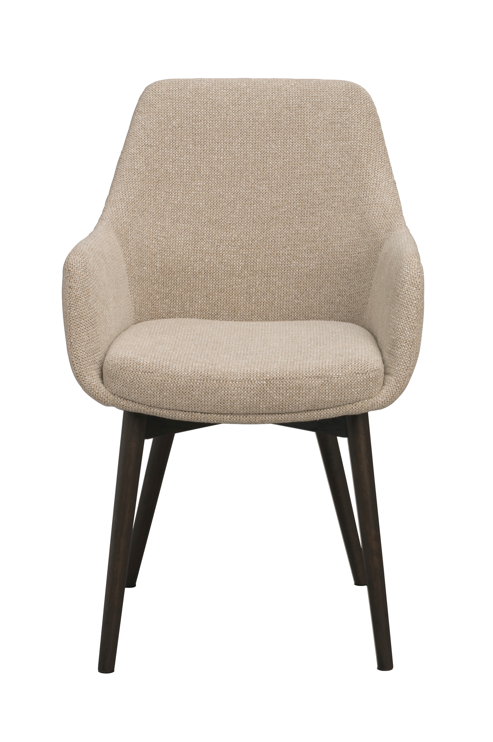 Denley spisestol med armlener, trukket i stoff og med ben i eik, er en tidløs og innbydende stol som kombinerer myk komfort med et harmonisk og varmt uttrykk. Det sjenerøse setet og de integrerte armlenene gir en omsluttende støtte, noe som gjør stolen svært komfortabel - ideell for lange middager og samtaler rundt spisebordet. Setet er trukket i et mykt stoff med en litt grovere tekstur, noe som skaper en livlig, taktil følelse som gir både dybde og karakter til rommet.