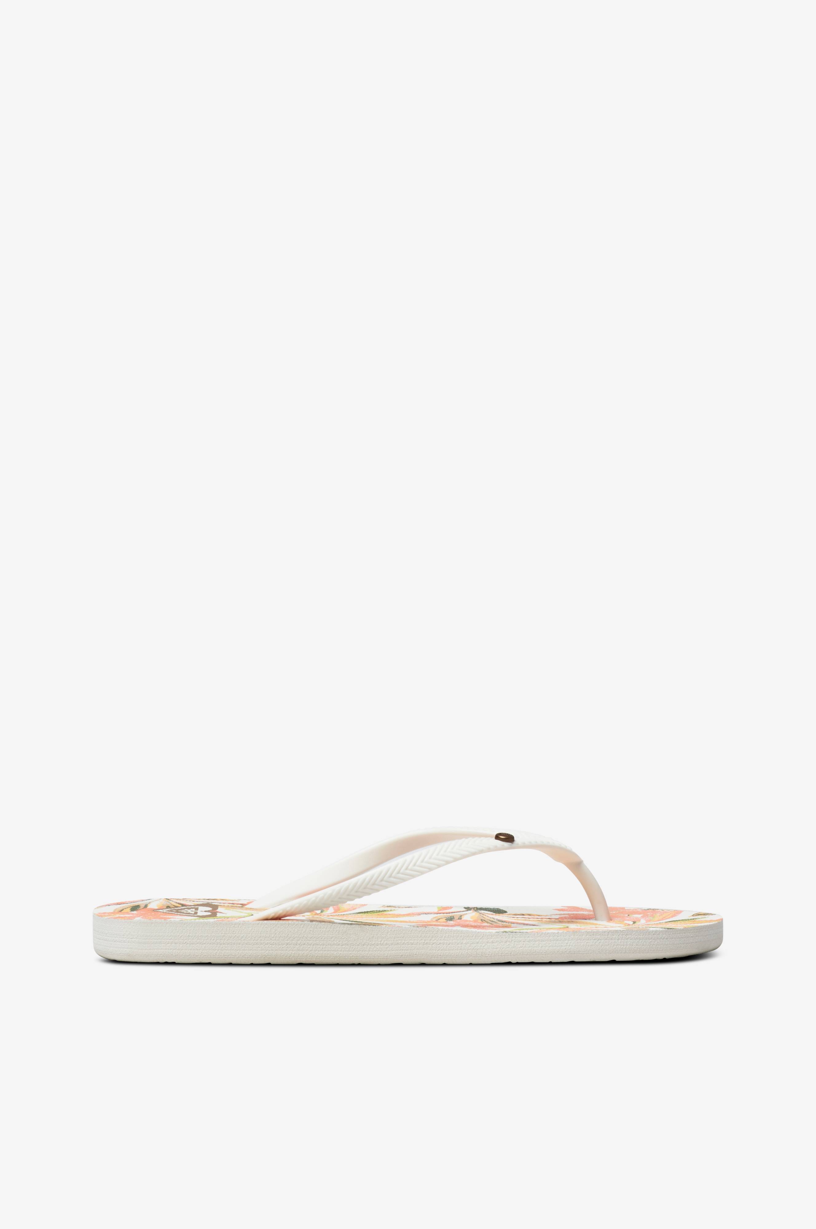 Flip-flops med remmer i syntetisk materiale, fotseng i gummi og sviktende såle i EVA.