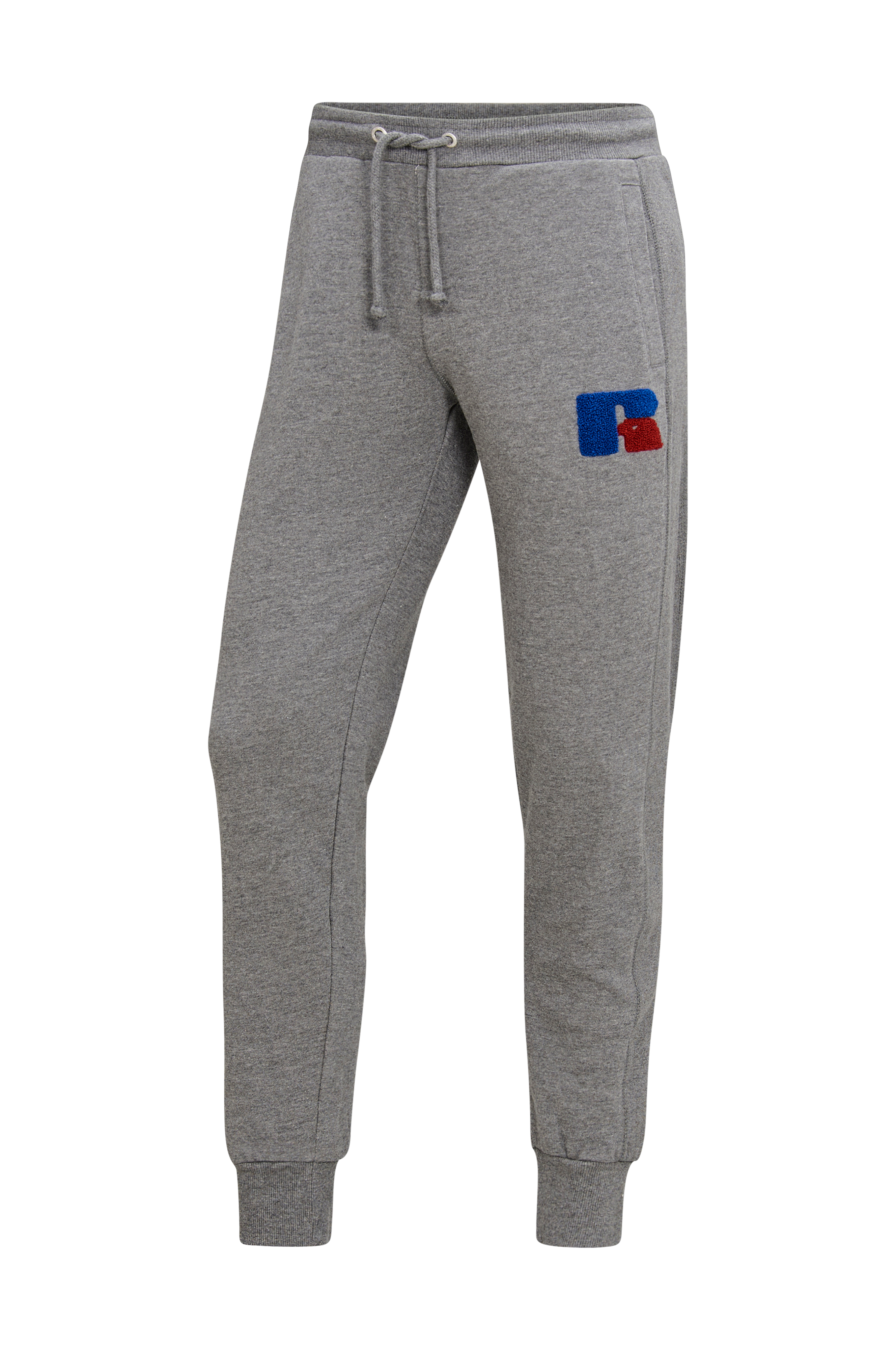 Joggebukse RU Austin-Cuffed Jog Chen Emb fra Russell Athletic med logo i frotté på hoften. Ribbestrikket, elastisk linning med snøring. To sidelommer og en baklomme. Ribbestrikket panel langs sidene på bena og vrangbord i benkantene.