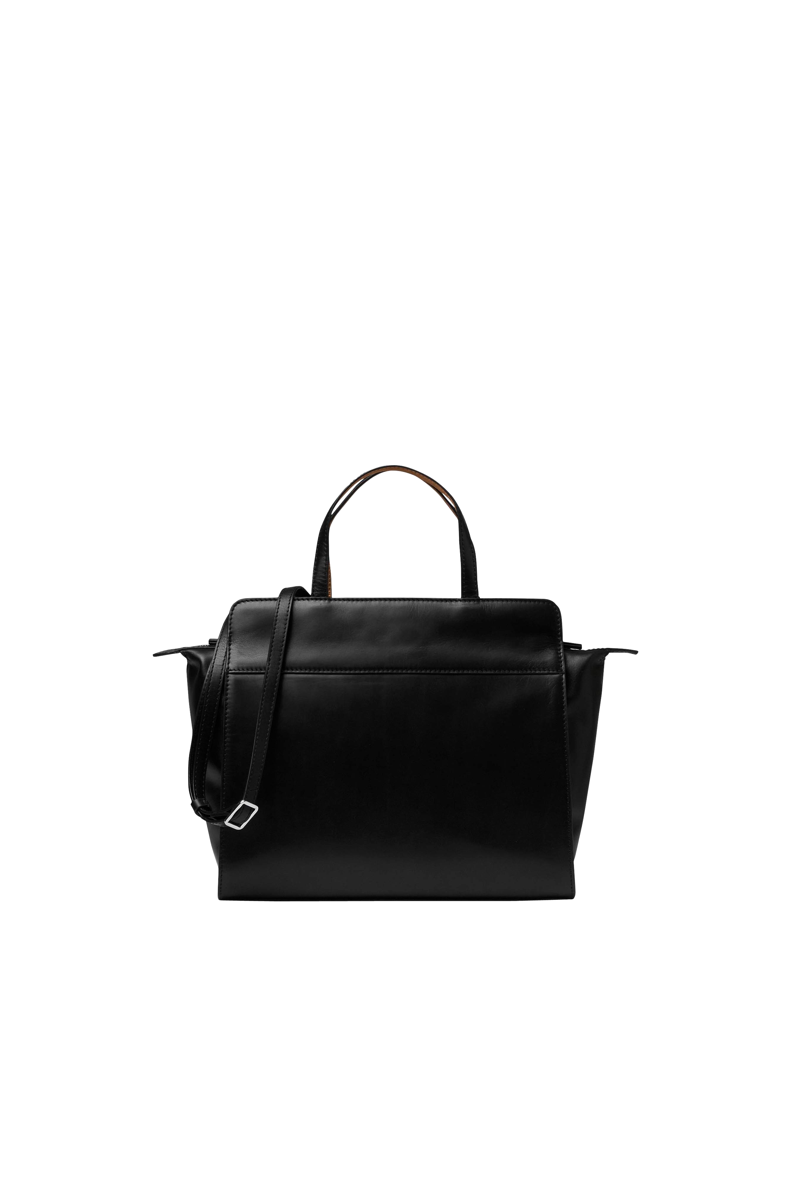 • Vesken i skinn• Bærehåndtak• Justerbar skulderstropp• Hovedlomme med to-veis glidelås• En innvendig glidelåsrom• En åpen innerlomme• Tekstilfôr