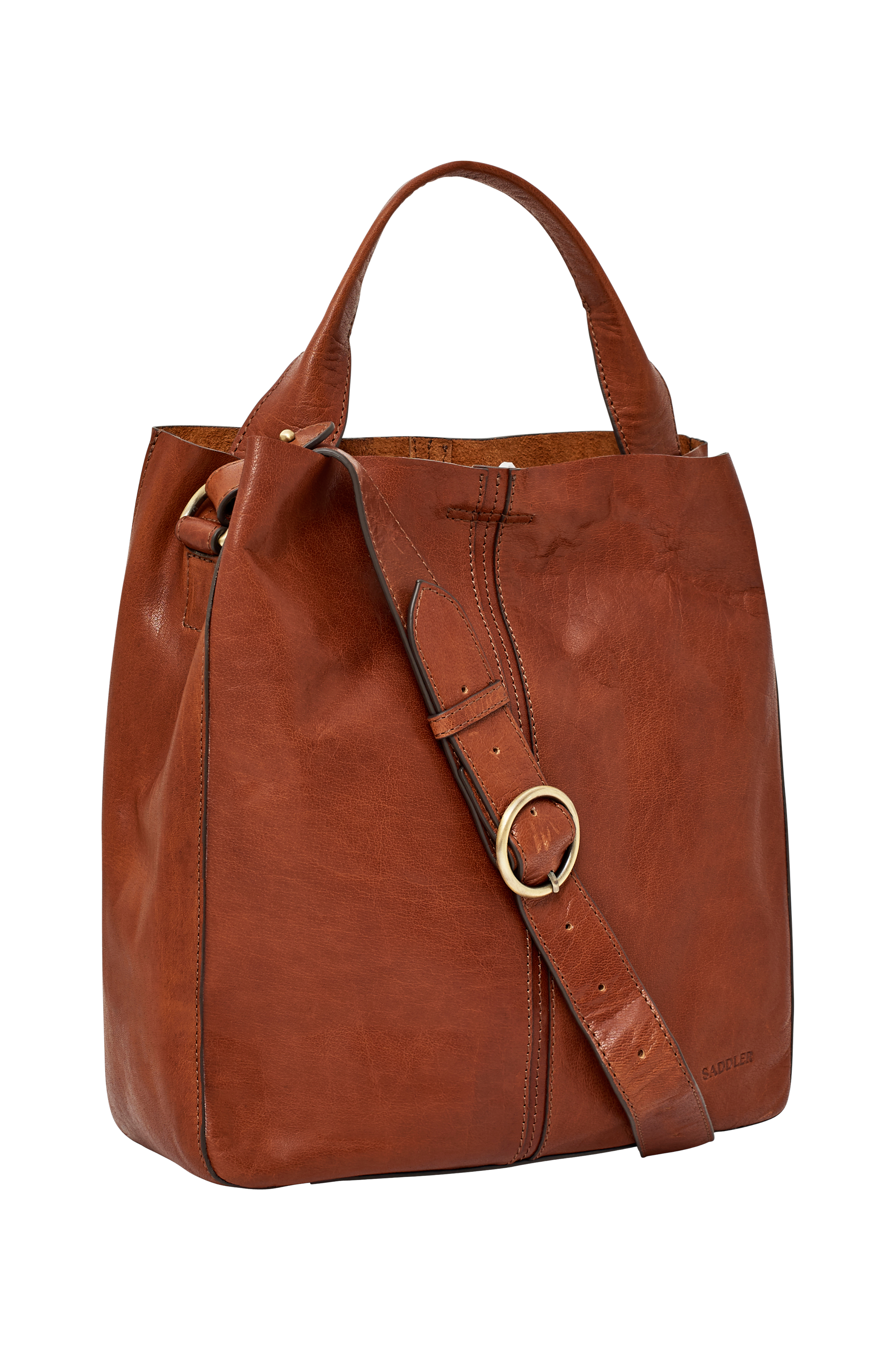 Skulderveske Elsa fra Saddler i mykt og smidig, ufôret skinn. Vesken er delt i to deler av en stor glidelåslomme i tekstil, og har en innvendig mobillomme. Vesken lukkes med magnettrykknapp. Den korteste remmen er fast og den lange har justerbar lengde og er avtagbar.