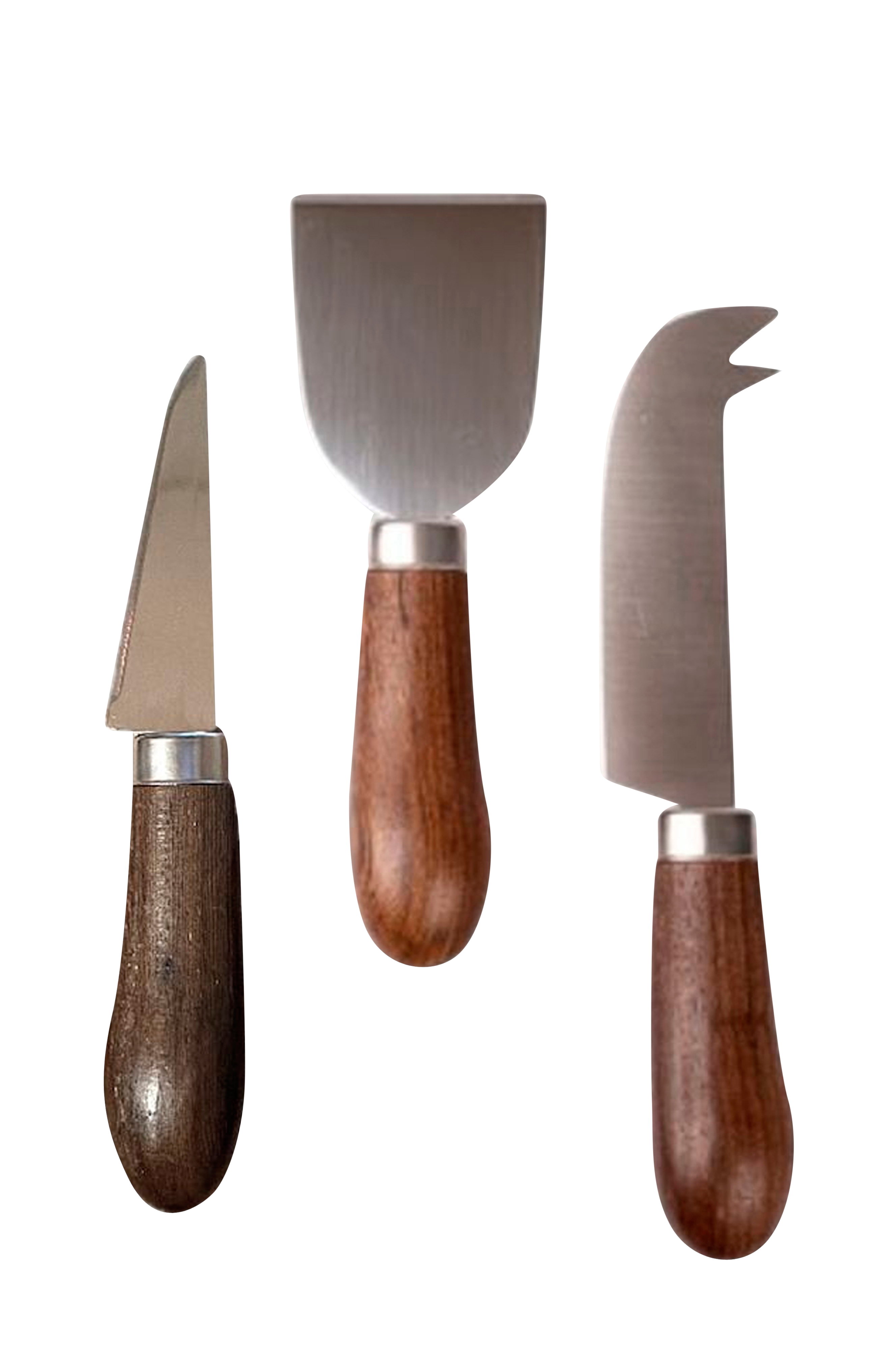 3-delt osteknivsett av rustfritt stål med vakre, buede håndtak i sjokoladebrunt wengetre. Mål: 17,5x3x2,5 cm/14,5x5x2,5 cm/14,5x3x2,5 cm.