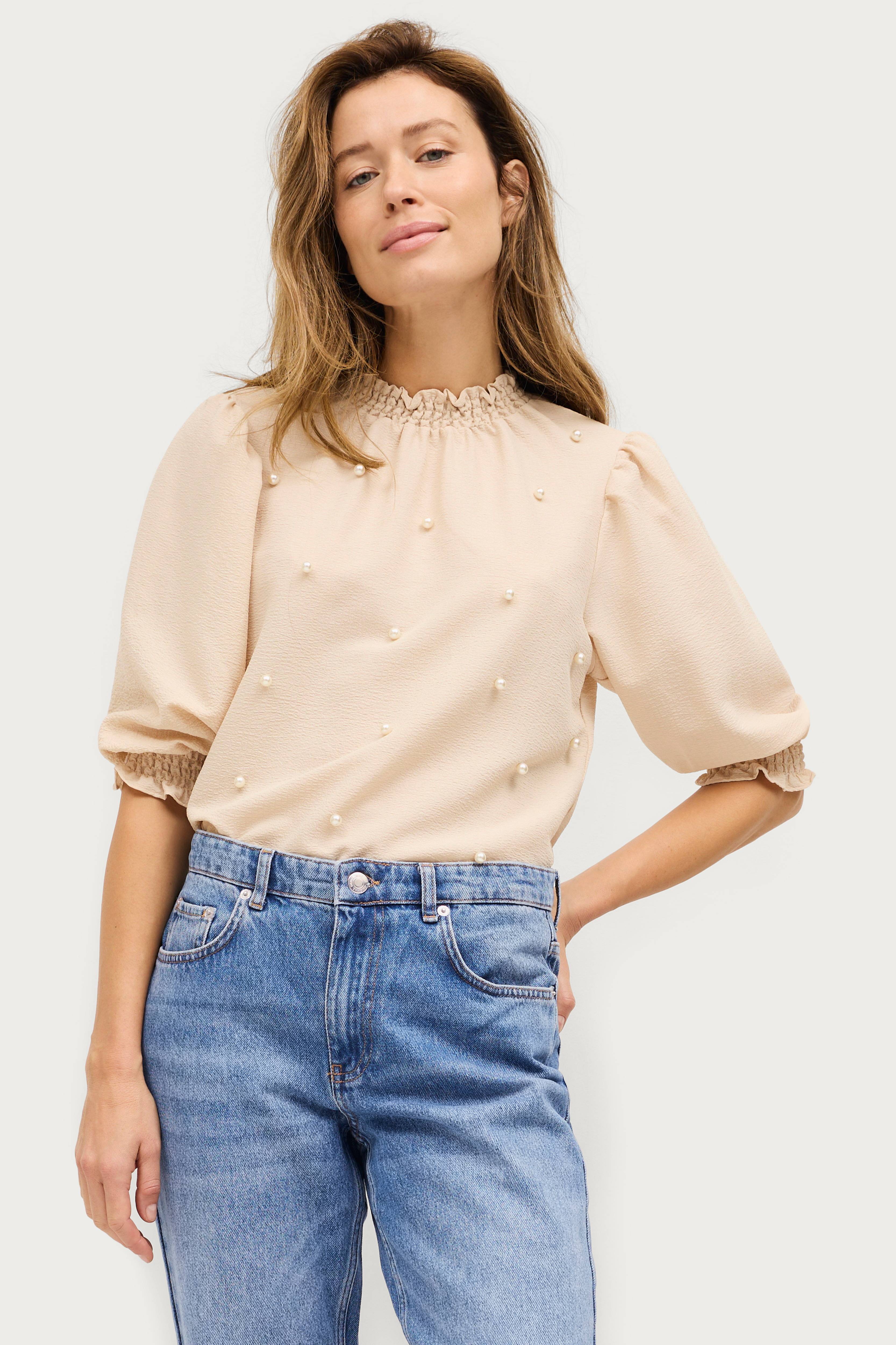 • Dekorative perler foran• Vaffelsøm i halsen og ved armenden• Bobleermer 3/4 lang• Kreppet kvalitet
