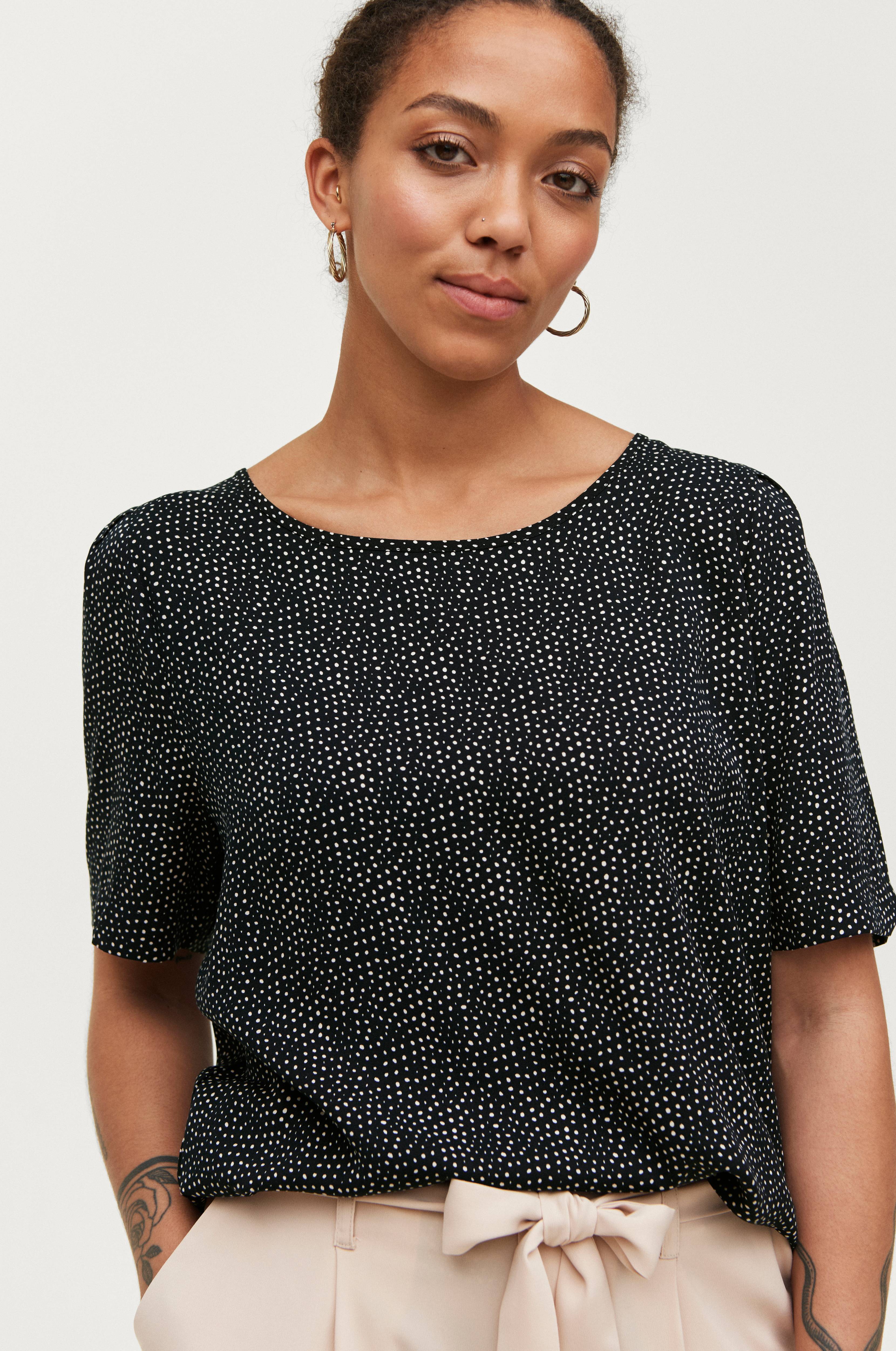 Bluse i vevd kvalitet. Lett utsvingt modell med korte ermer med lagte legg på skuldrene.