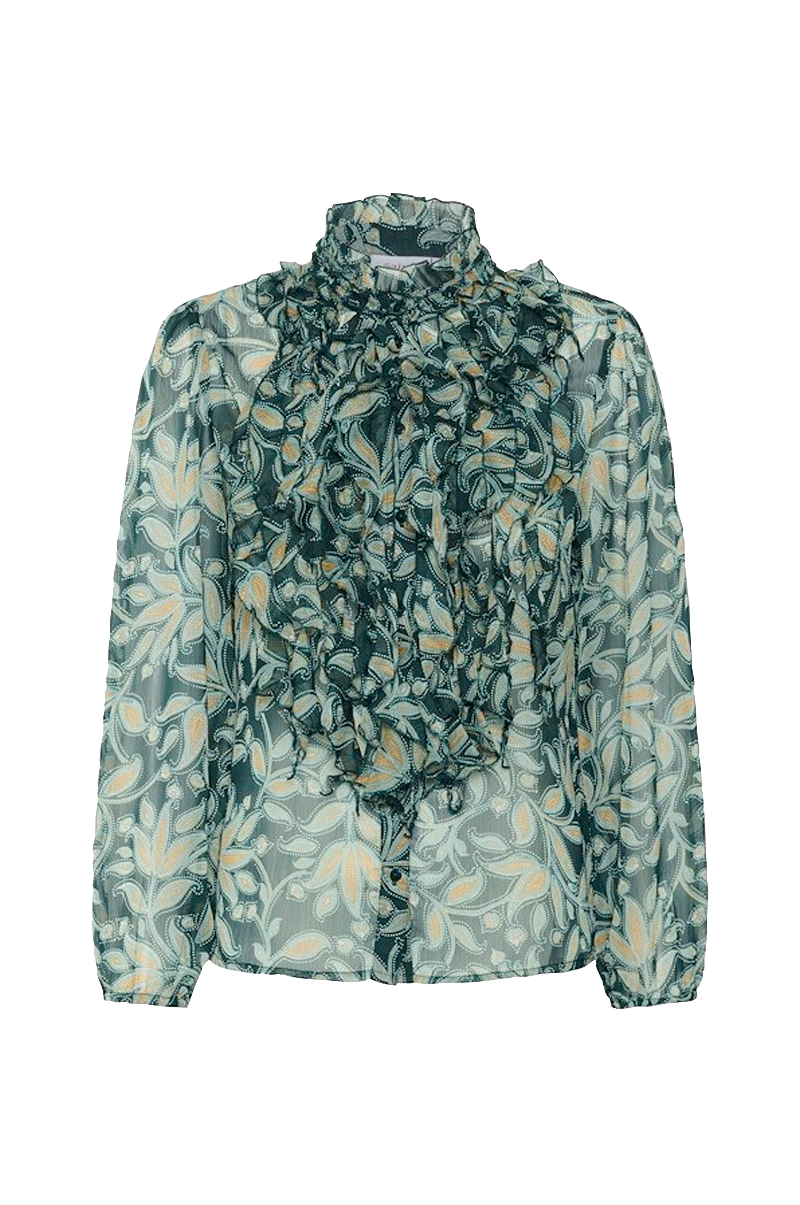 • Modell i chiffon• Halvhøy krage• Volanger på brystet• Langt erme med elastisk strikk i ermeslutten