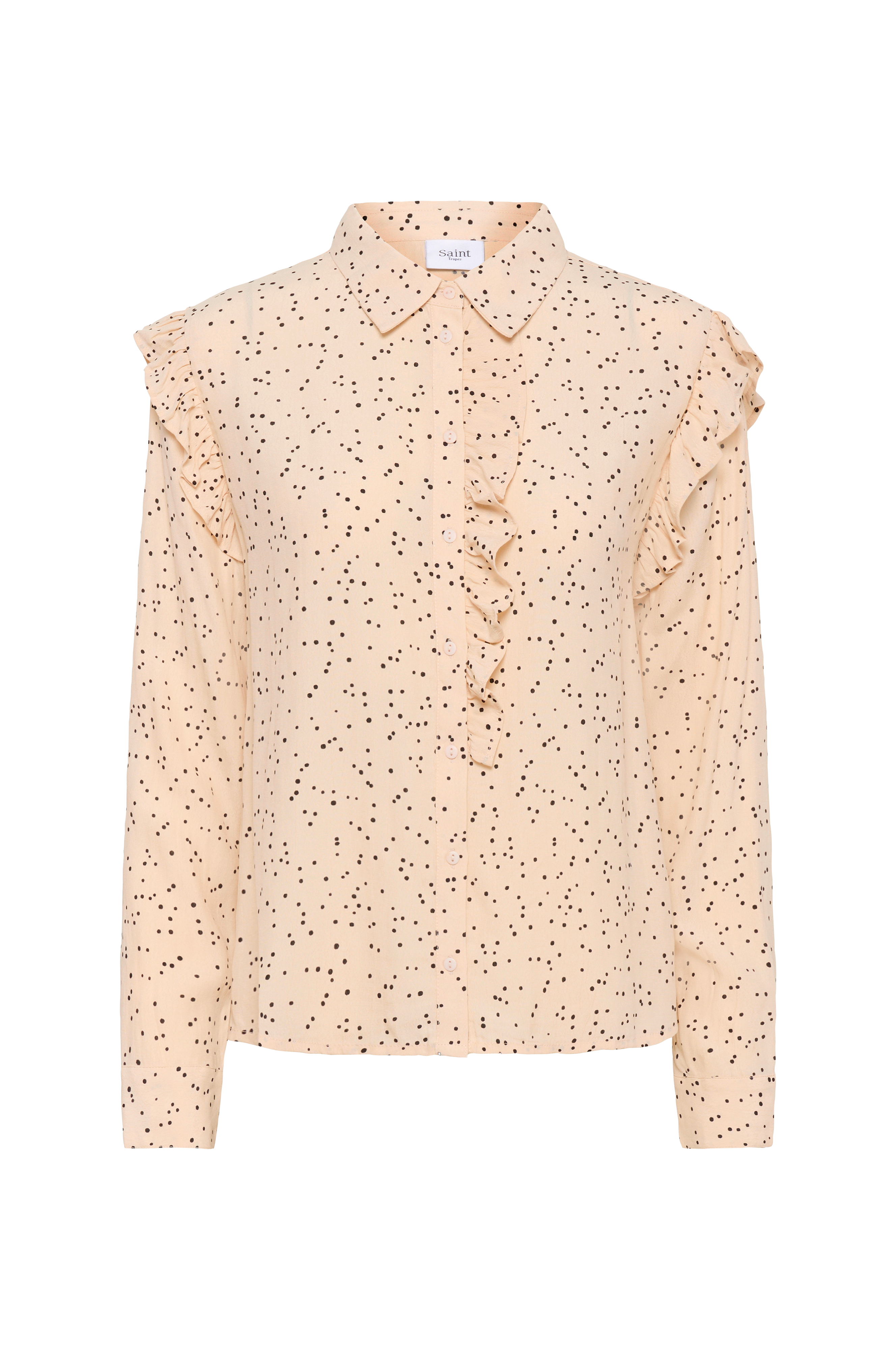 • Semitransparent bluse i viskose• Klassisk skjortekrage• Lukking foran• Volangdetaljer langs framsiden og rundt skuldrene• Lange ermer med mansjetter• Splitt nede i sidene