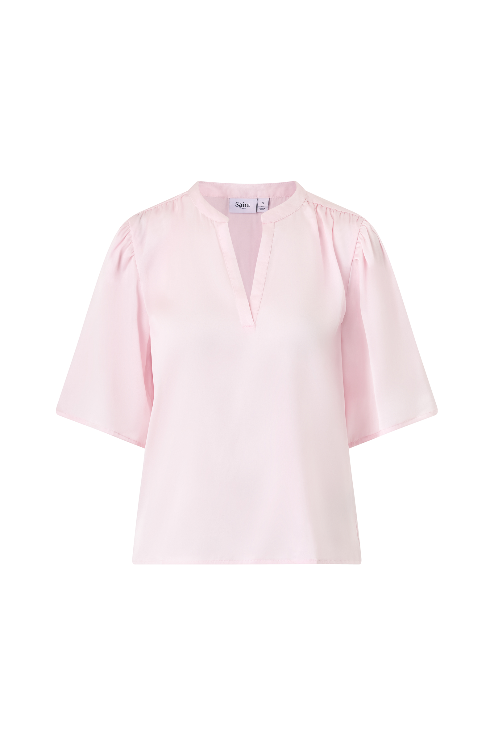 • Bluse i sateng• V-formet hals• Halvlange puffermer