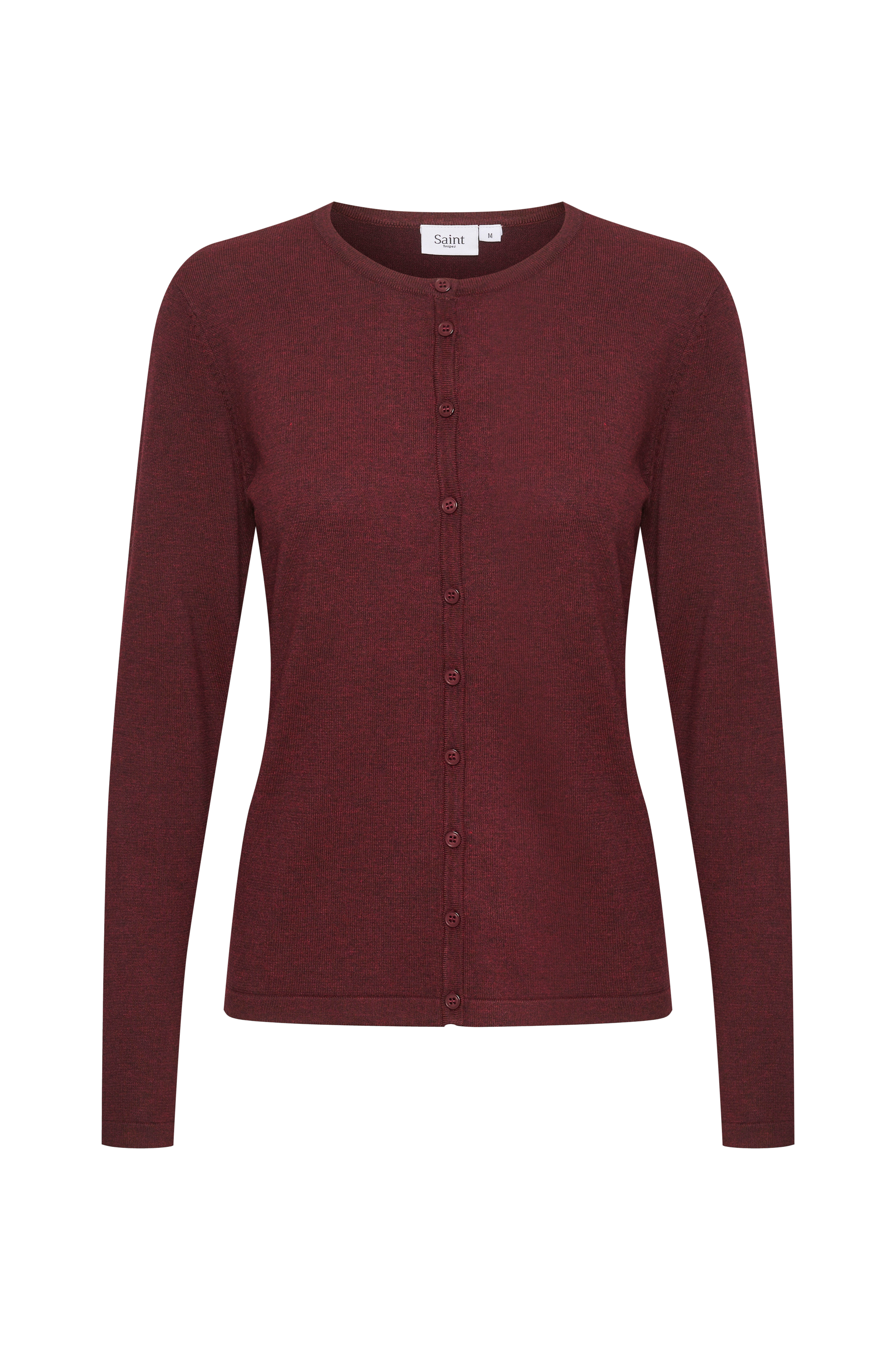 Cardigan fra Saint Tropez i fin, glattstrikket kvalitet. Lett figurformet modell med rund hals og lukking hele veien foran. Smal vrangbord i hals og knappestolpe. Lengde ca. 58 cm i str M.