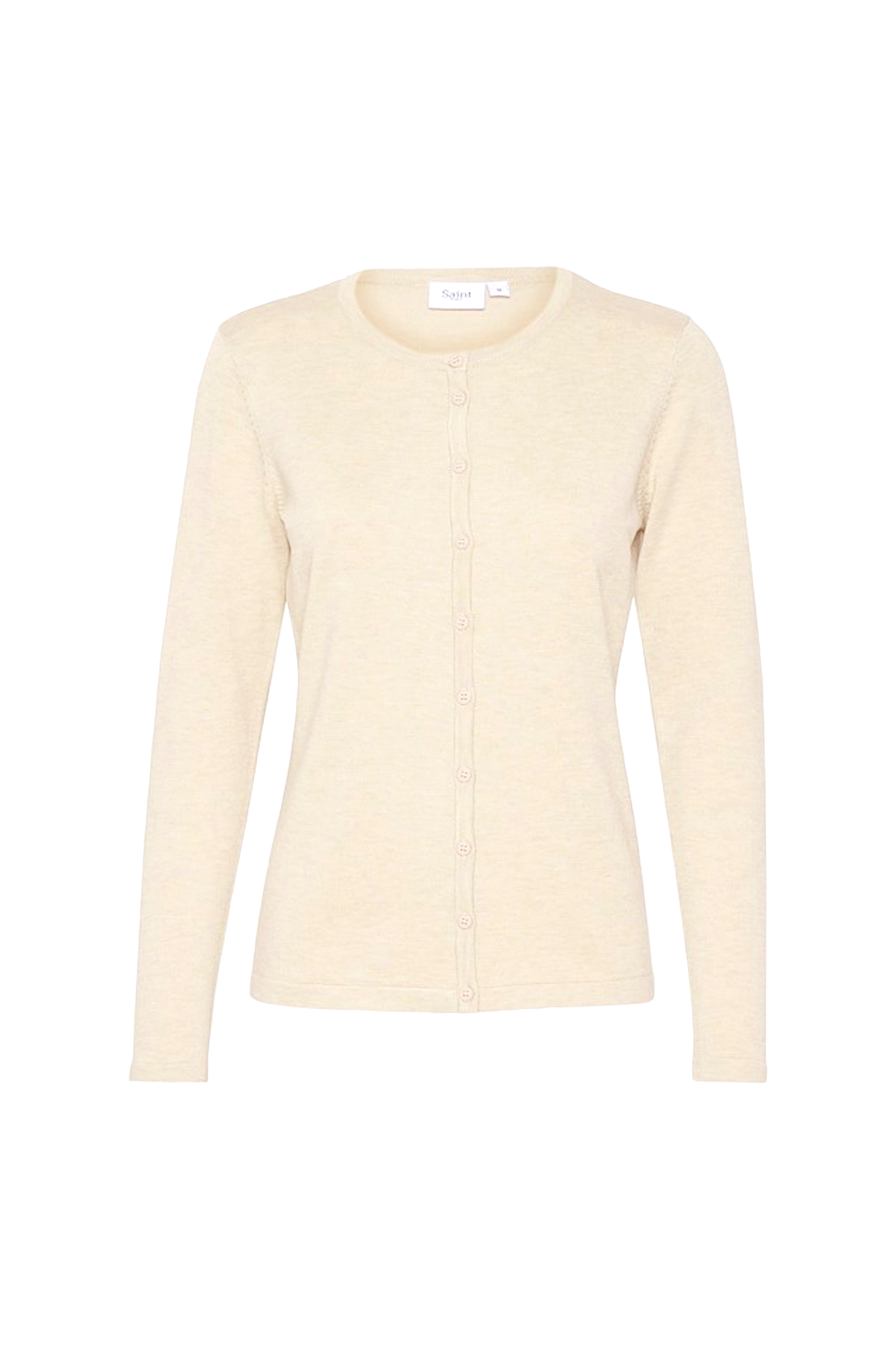 Cardigan fra Saint Tropez i fin, glattstrikket kvalitet. Lett figurformet modell med rund hals og lukking hele veien foran. Smal vrangbord i hals og knappestolpe. Lengde ca. 58 cm i str M.