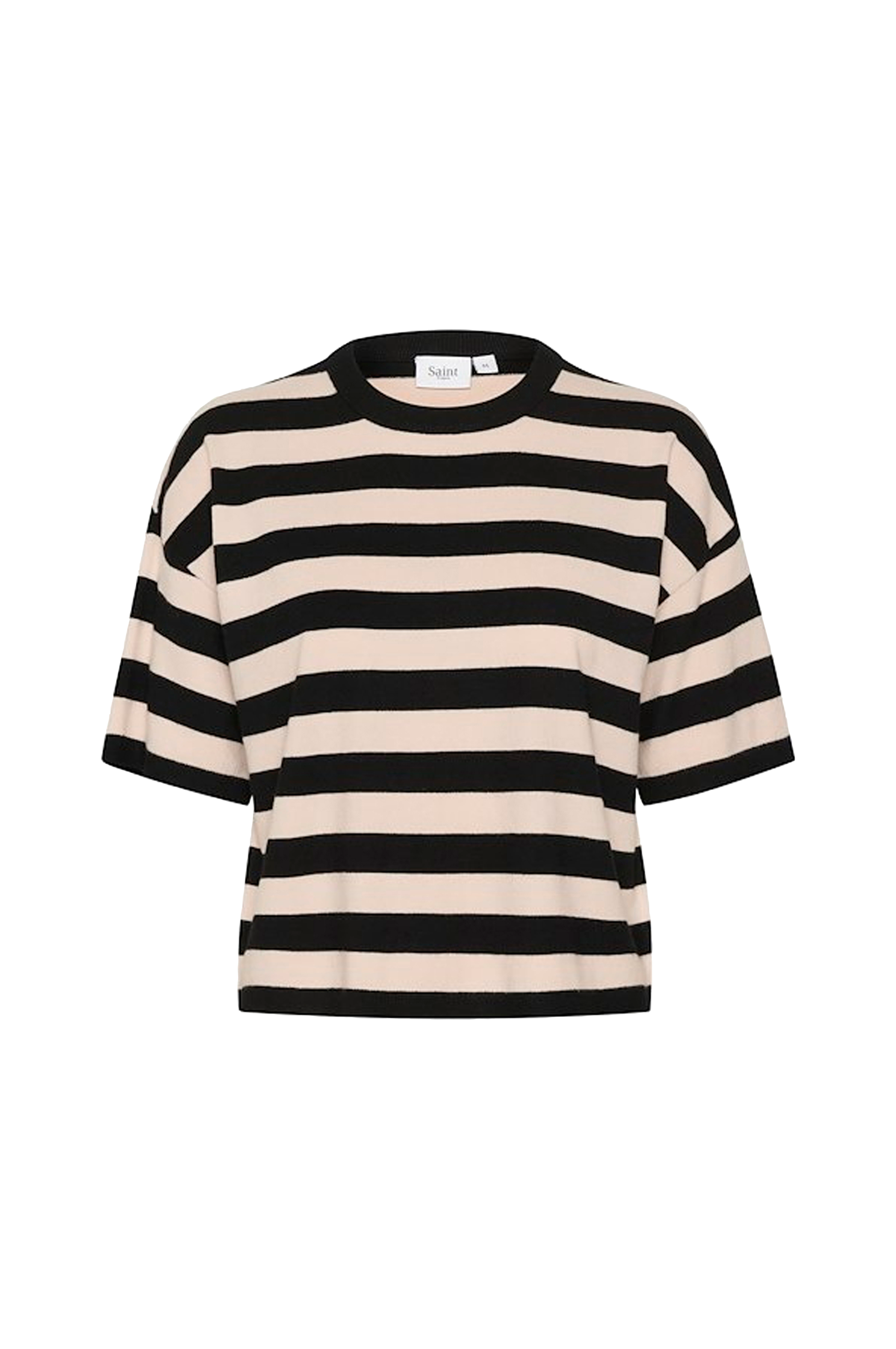 • Rett modell med strikket striper• Rund hals med ribbet kant• Utringet skulder med kort erme• Smal ribbestrikk i ermeslutten og i nedre kant