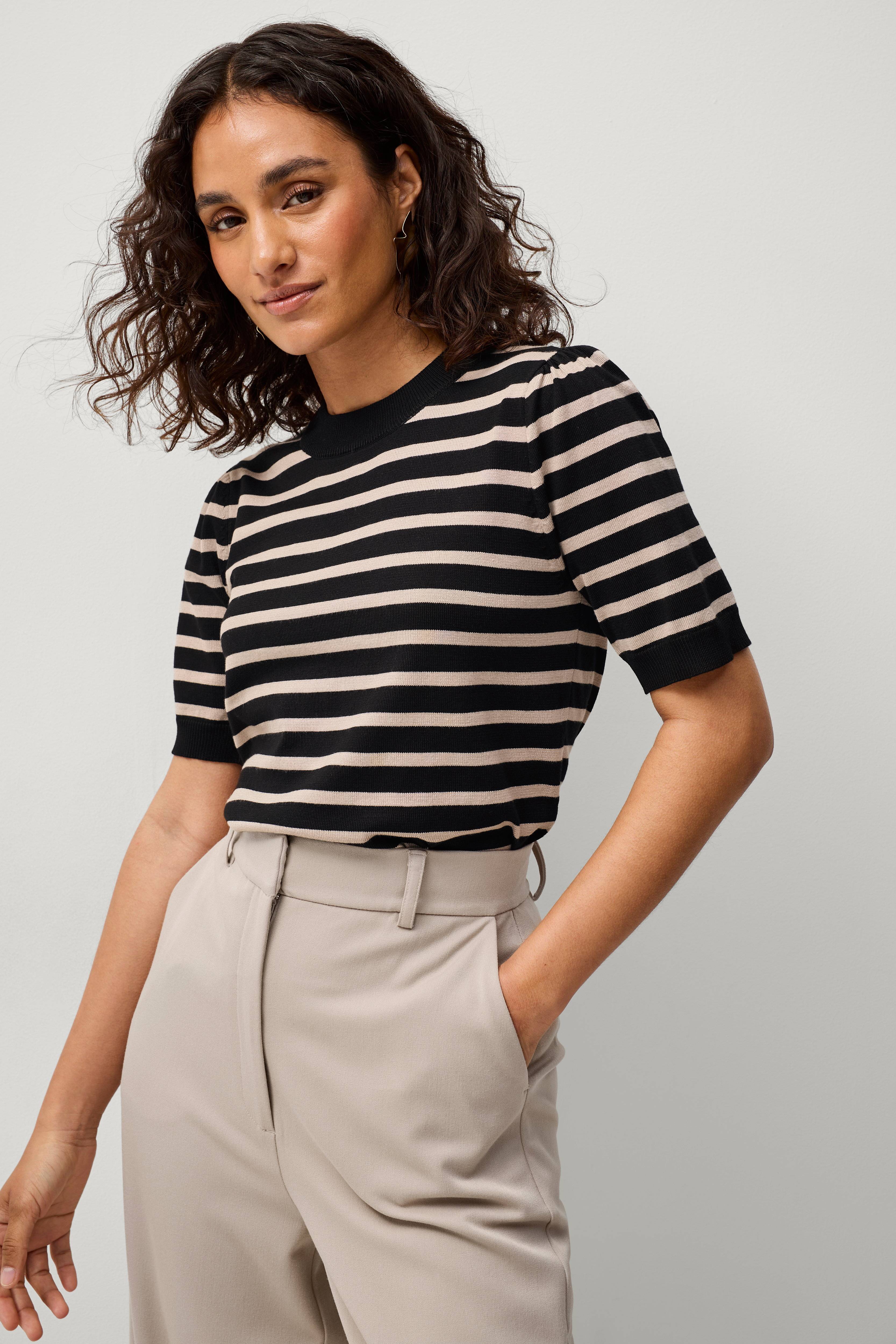 • Tynn, finstrikket genser i viskosemiks• Korte bobleermer• Ribbet hals