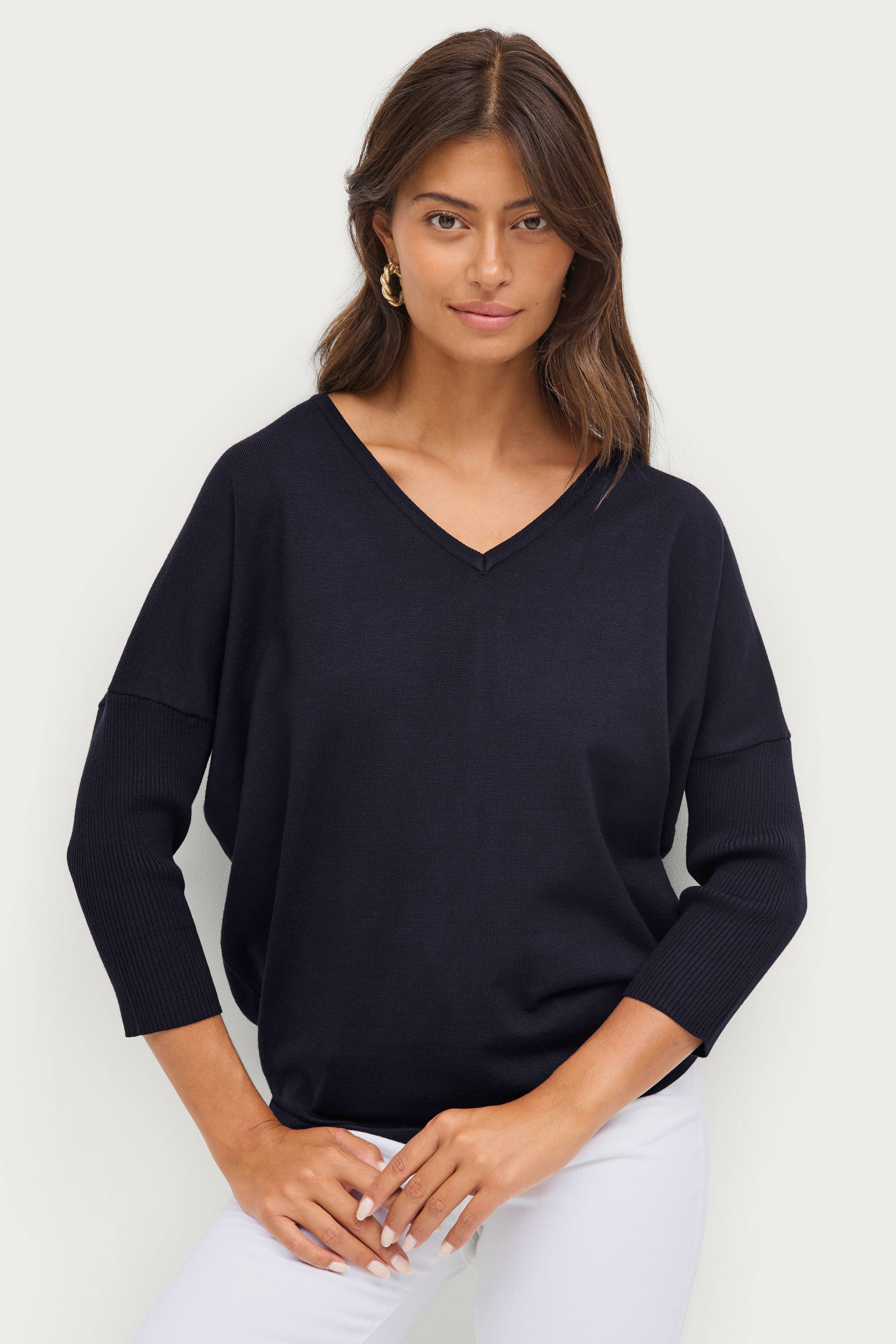 • V-hals snitt• Ribbet flaggermusermer 3/4 lang• Finstrikket kvalitet i viskosemiks
