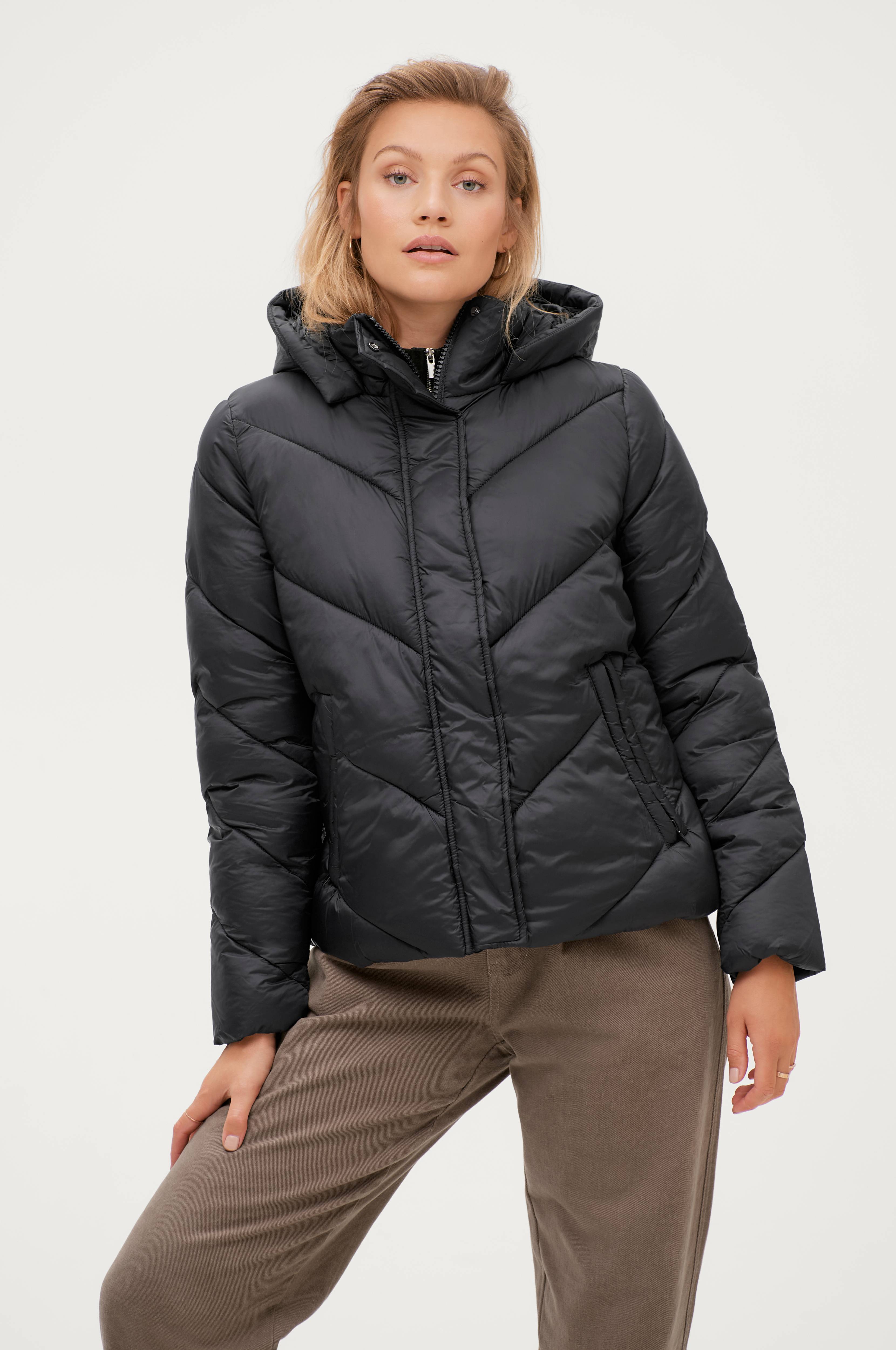 Jakke CatjaSZ Short Jacket fra Saint Tropez er en quiltet, lett vattert jakke med glatt, vevd fôr. Jakken har fast hette, høy krage og lukkes med glidelås og en beskyttende vindstolpe med trykknapper. To lommer med glidelås. Lengde ca. 61 cm i str S.
