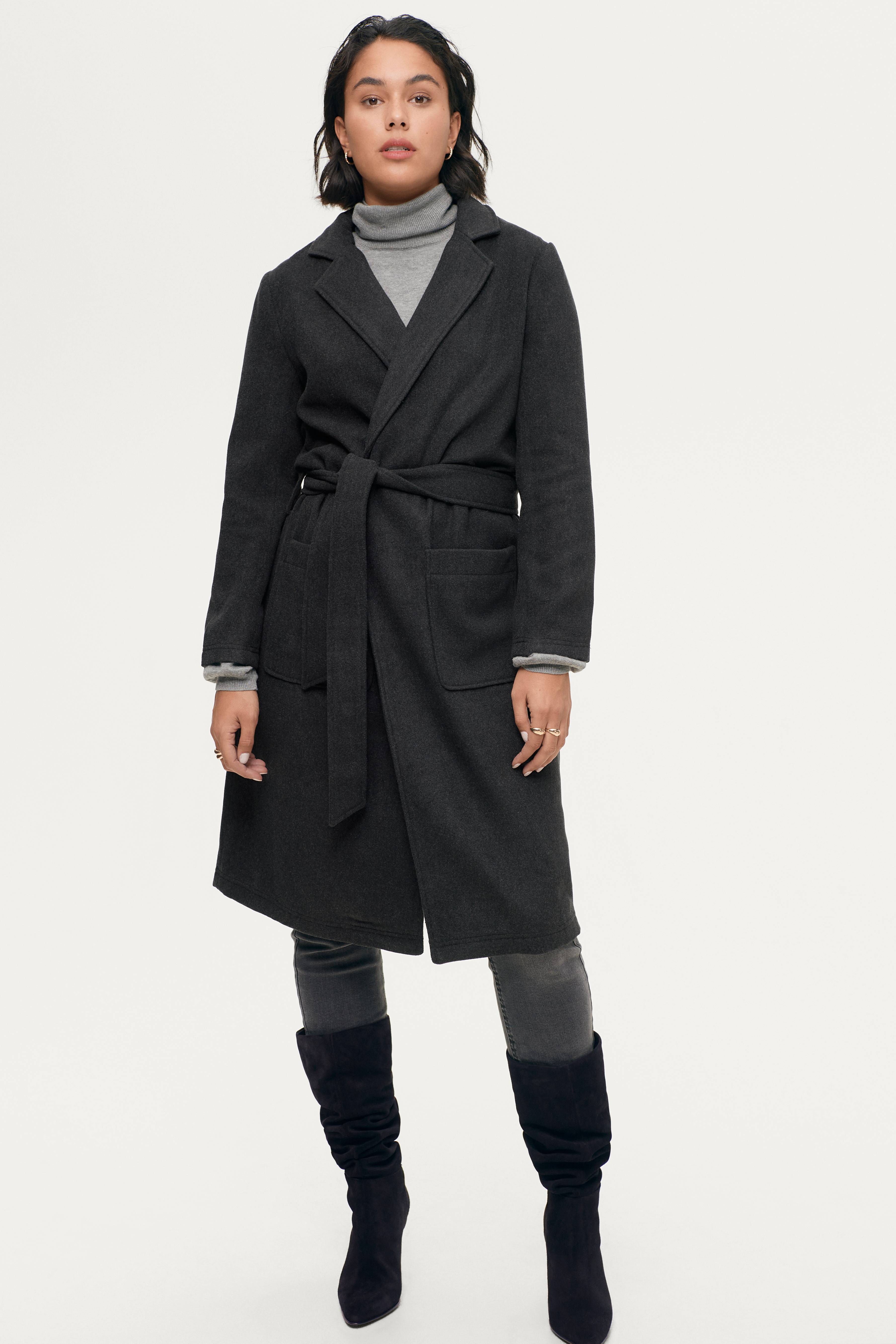 Kåpe ClaraSZ Coat fra Saint Tropez, medium lang, ledig modell med knytebelte i midjen og to store lommer foran. Myk kvalitet med andel av ull. Ufôret. Lengde ca. 109 cm i str S.