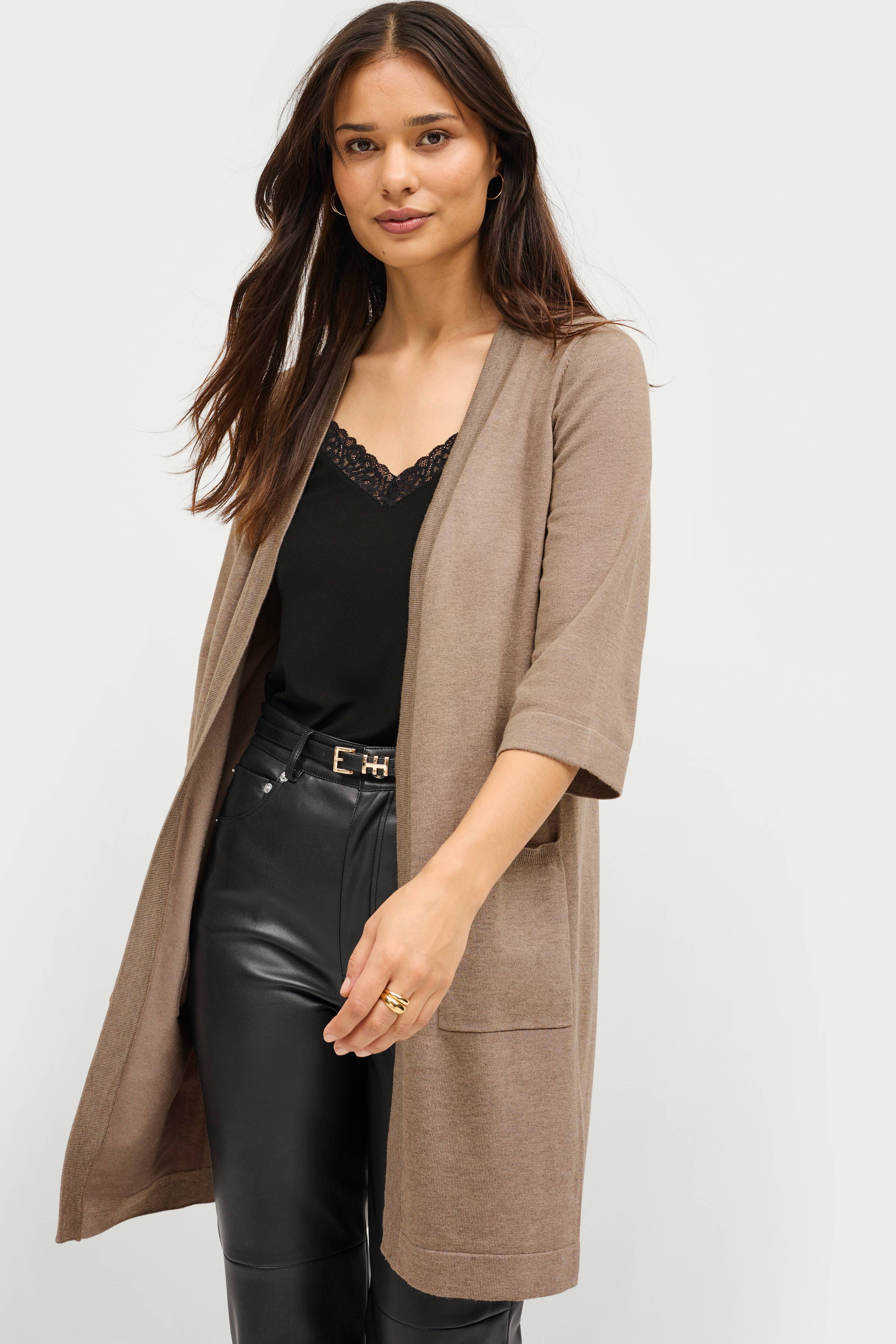 • Strikket, lang kardigan• Åpen modell• Halvlange armer• To lommer