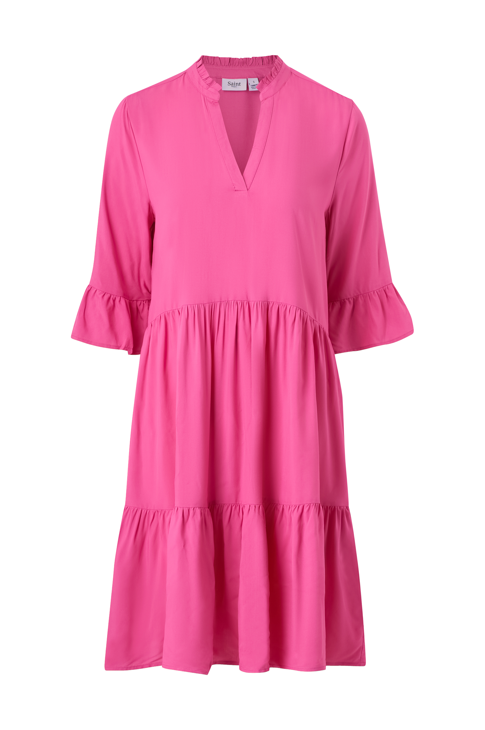 Kjole EdaSZ Solid Dress fra Saint Tropez. Utsvingt modell med ledig snitt i smidig, vevd kvalitet. Rund hals med liten volangkant og V-utringning foran, samt 3/4-lange ermer med påsydd volang i ermekantene. Avskjæring med rynker i midjen og bred, påsydd volang i nederkanten. Lengde ca. 103 cm i str S.
