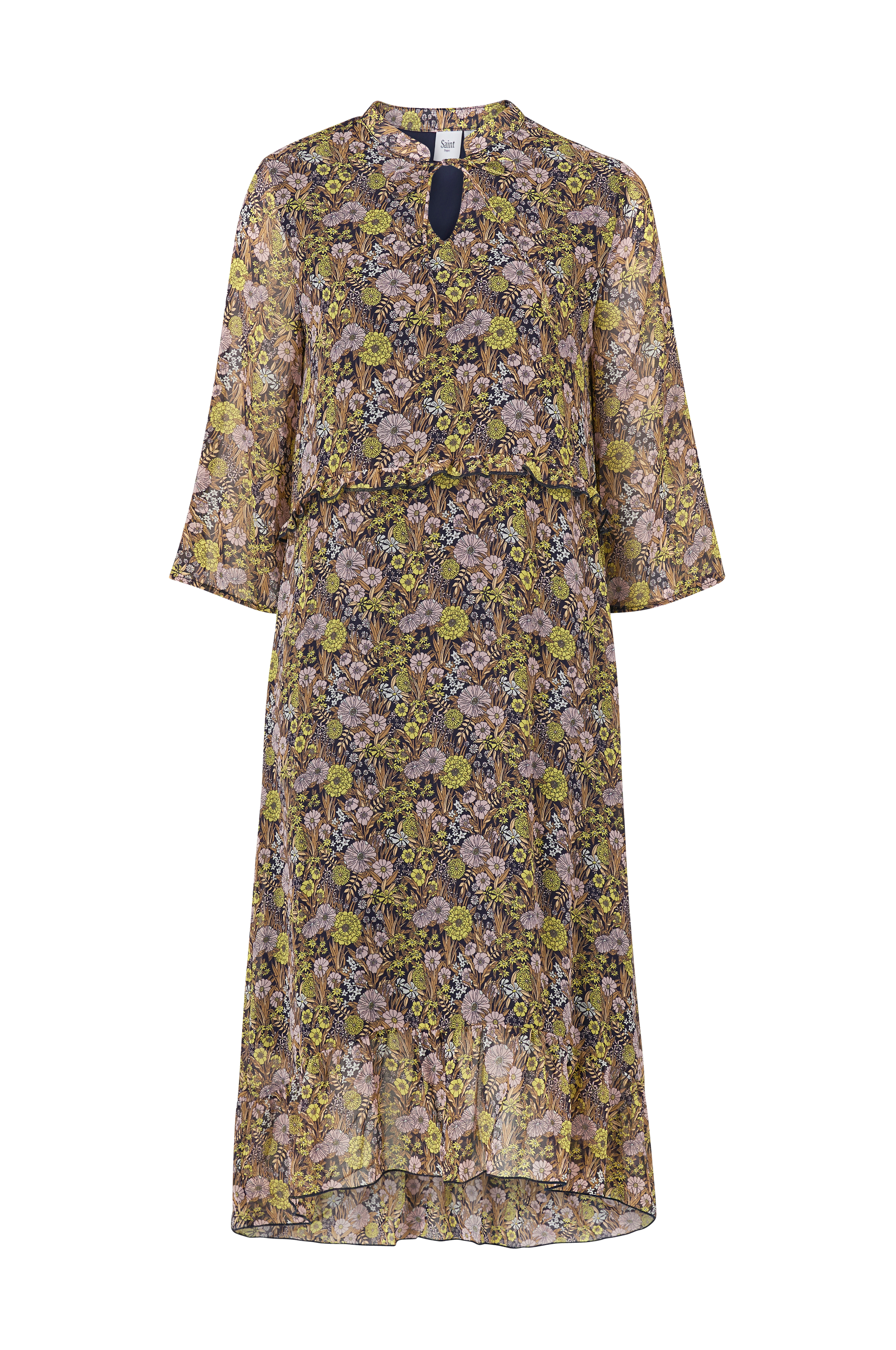 Kjole fra Saint Tropez i småblomstrete chiffon og fôr i trikot. Gjennomsiktige 3/4-lange ermer. V-utringet hals foran og bak med knytebånd foran. Påsydd, kort volang rundt. Lengde ca. 120 cm i str S.