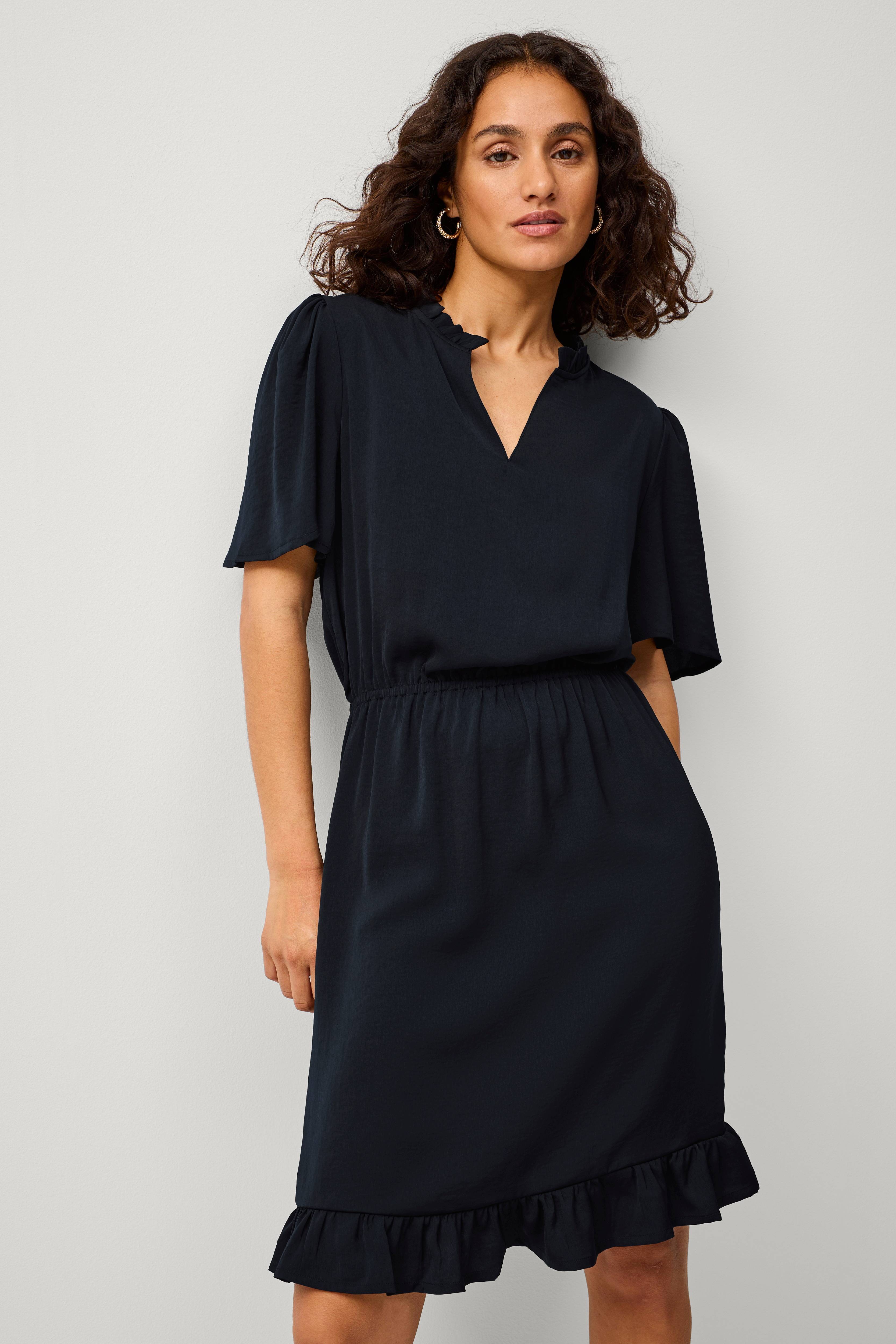• Modell i sateng• Innfelt gummistrikk ved midjen• Rund hals med liten volang og ventilasjon foran• Kort, bred bobleerme• Liten volang i nedre kant• Lengde: 100 cm i størrelse S