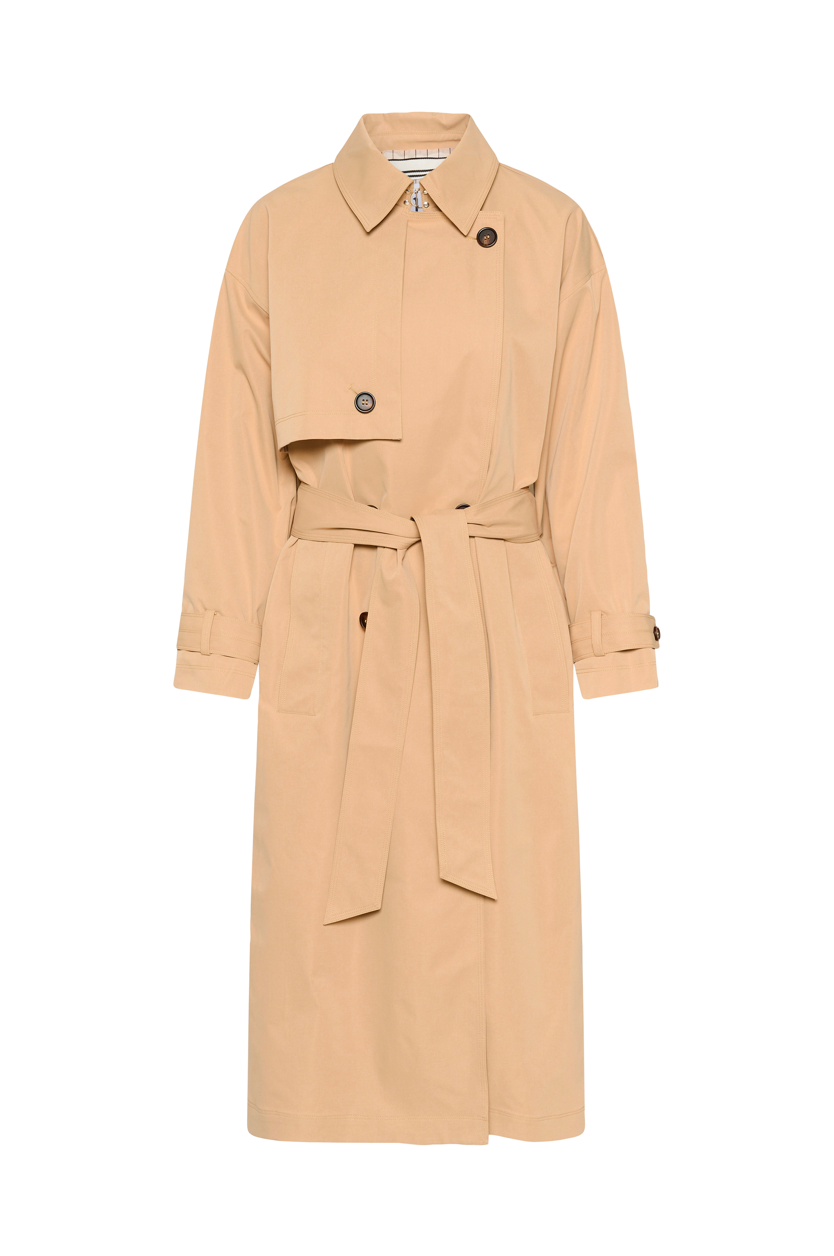 • Trenchcoat med krage og jakkeslag• Lange ermer• Remmer ved armenden• Midjebelte• Lukking med doble knapper foran• Sidelommer• Splitt nedover ryggen• Lengde: 124 cm i størrelse S