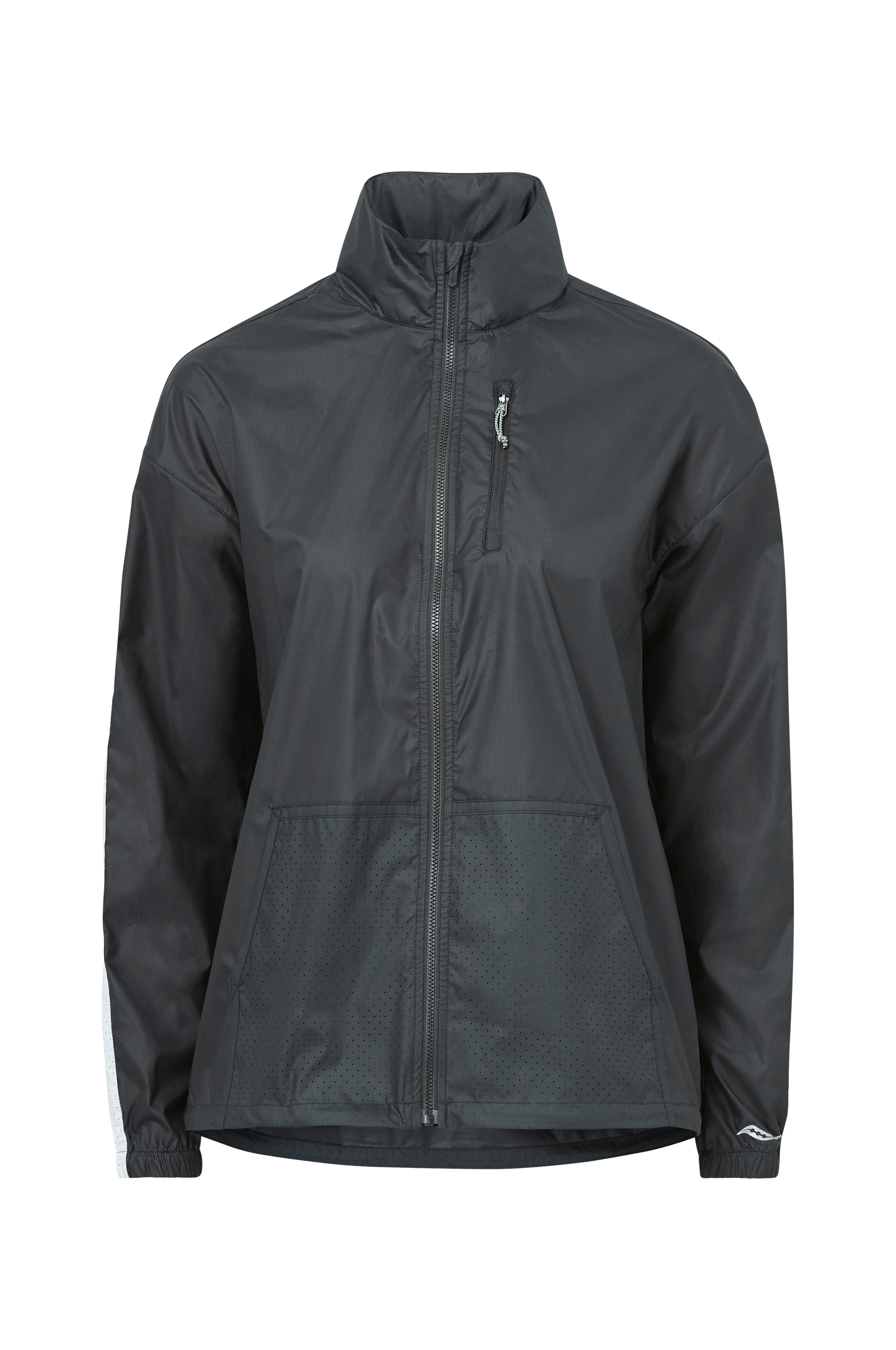 Løpejakke i lett, vevd kvalitet med vannavvisende overflate. Hette som kan pakkes inn i kragen. Glidelås. To lommer foran og en brystlomme med glidelås. Strikk i ermekantene og snøring med stopper i nederkanten. Jakken kan pakkes i lommen når den ikke brukes.