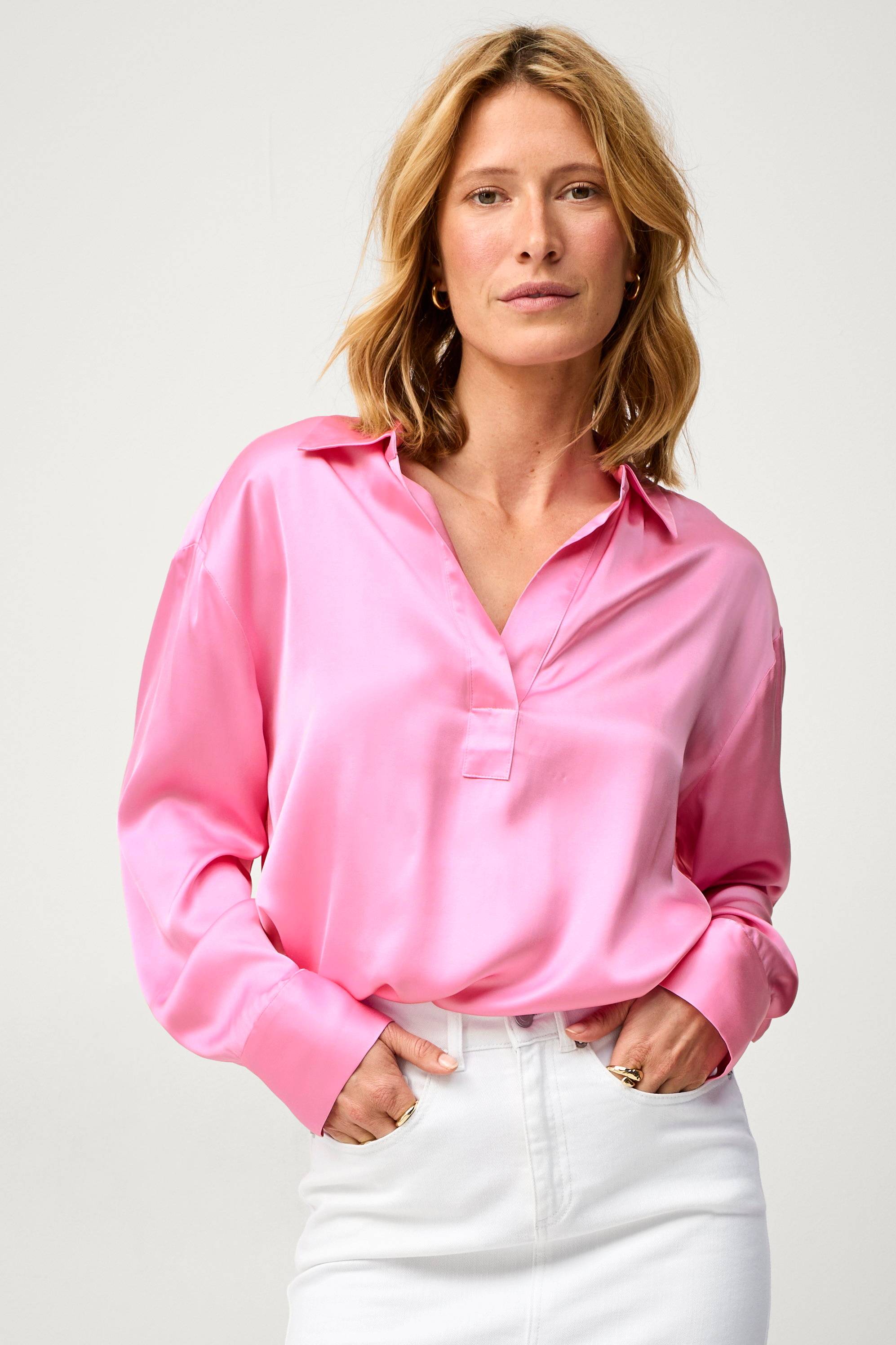 • Bluse i sateng• V-hals snitt med krage• Avrundet hem